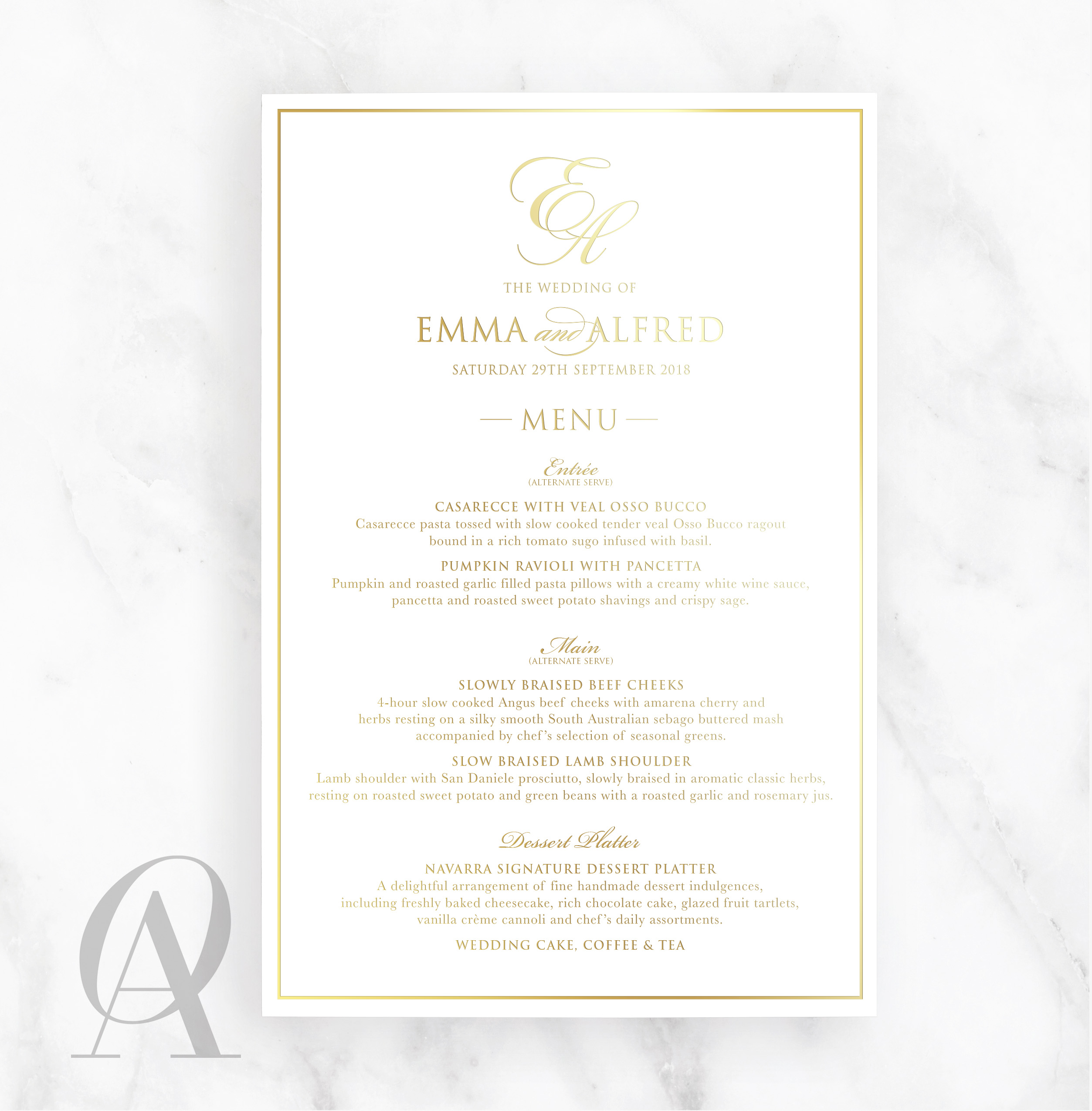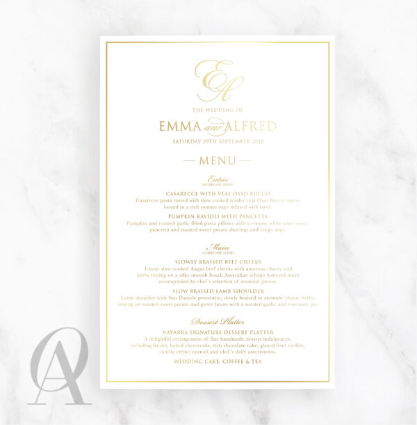 – All gold foil print on menu design with personalised text i.e your names, initials and wedding date.