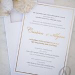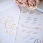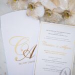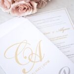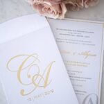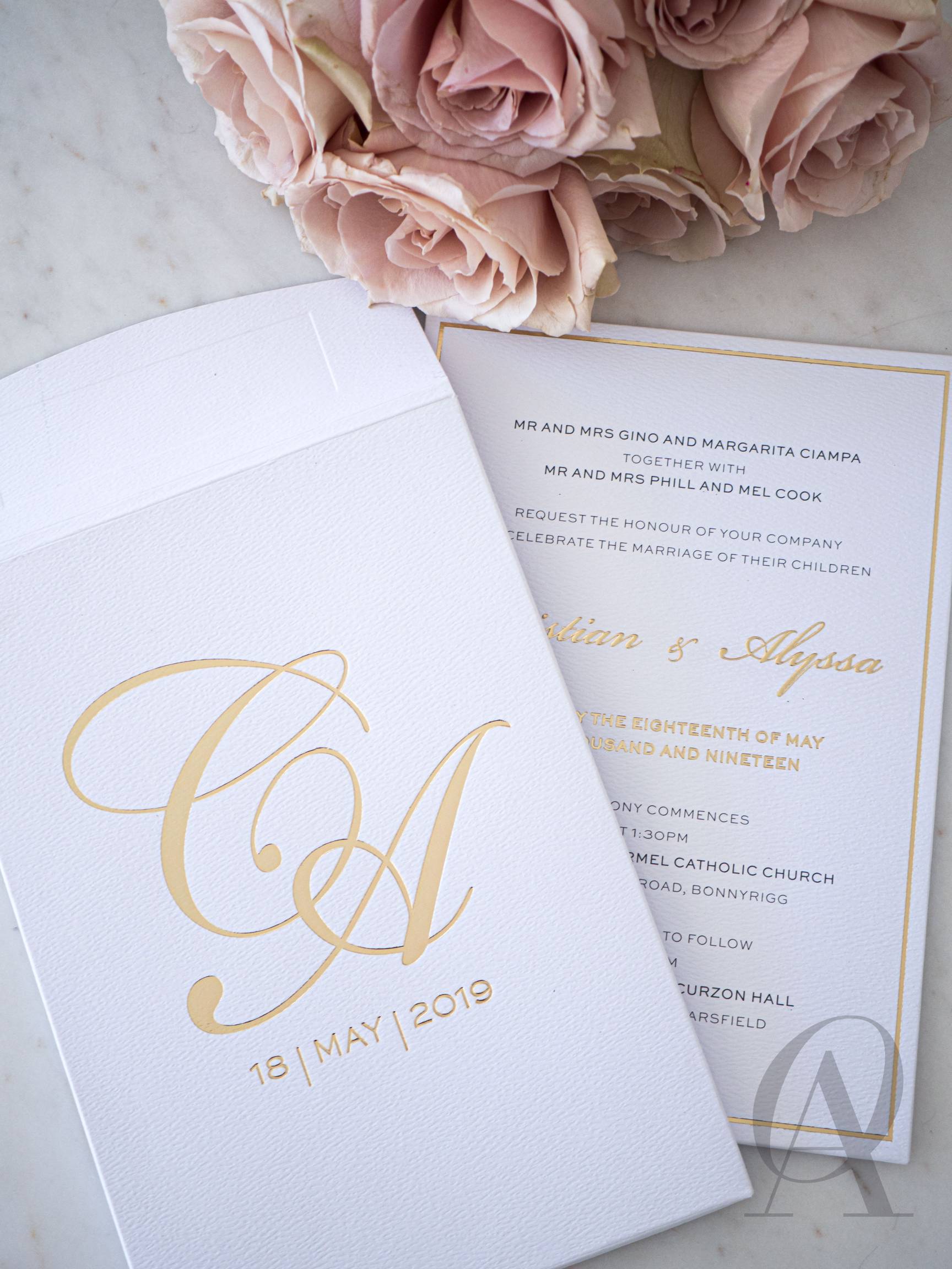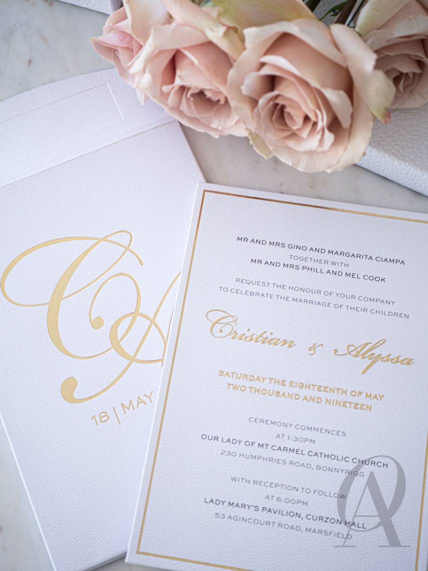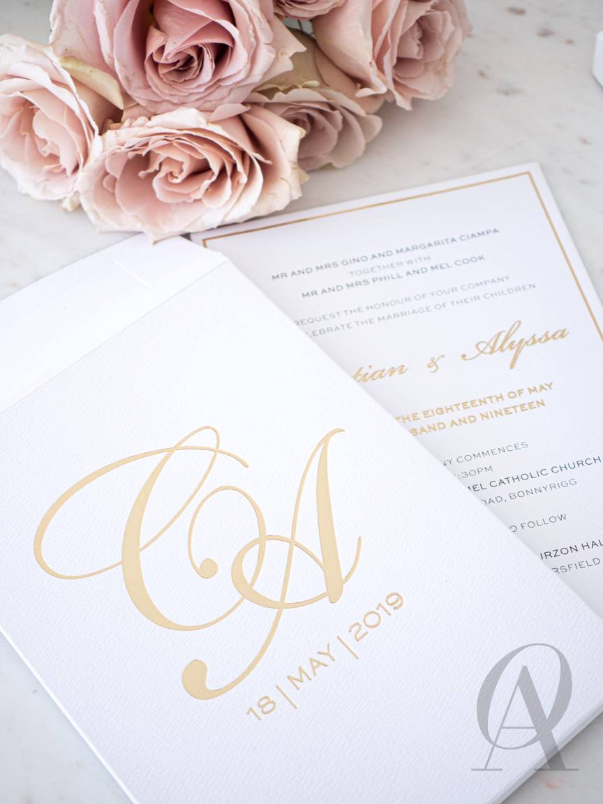 – Premium rigid board designed with your invitation details and a gold foil monogram customised with your initials.