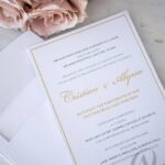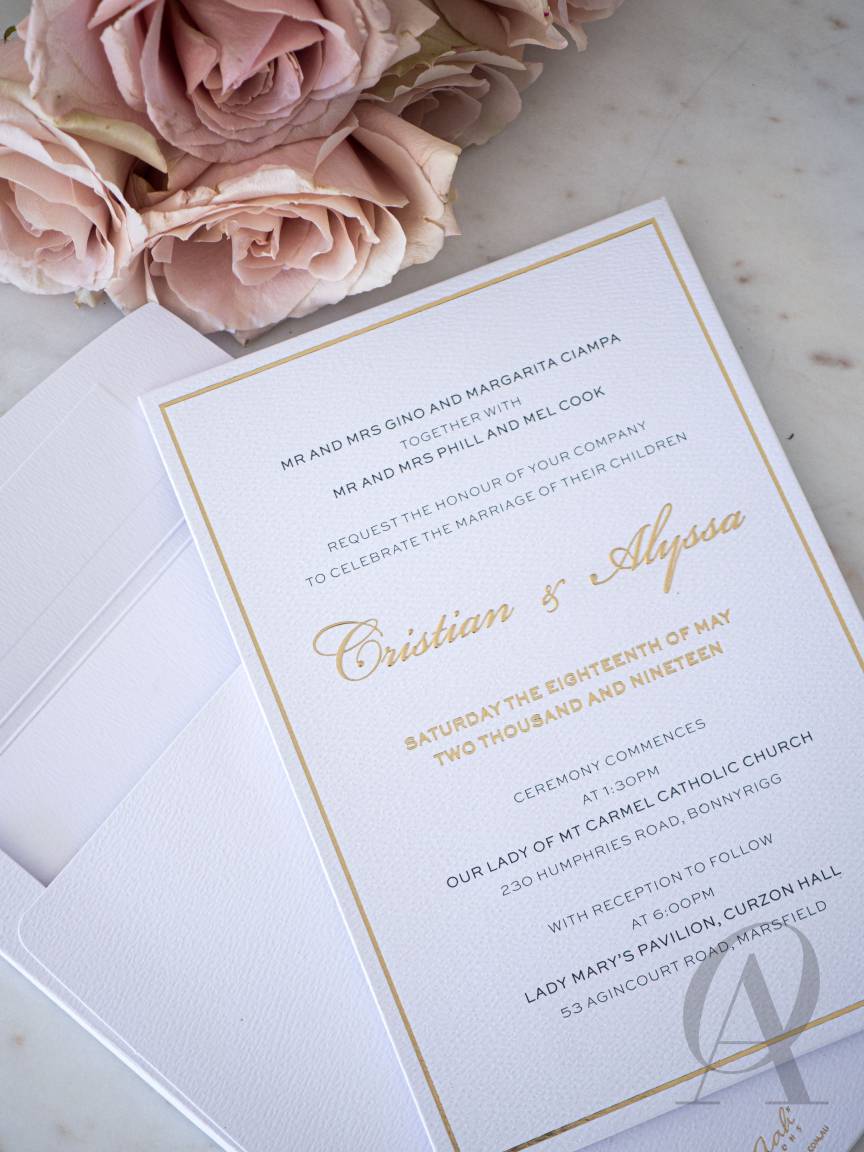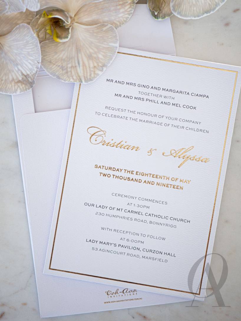 A beautiful blend of white and gold foil magnifies this simple and classic wedding invitation design. The design focuses on simple and classic typography creating a timeless design that will suit any wedding style.