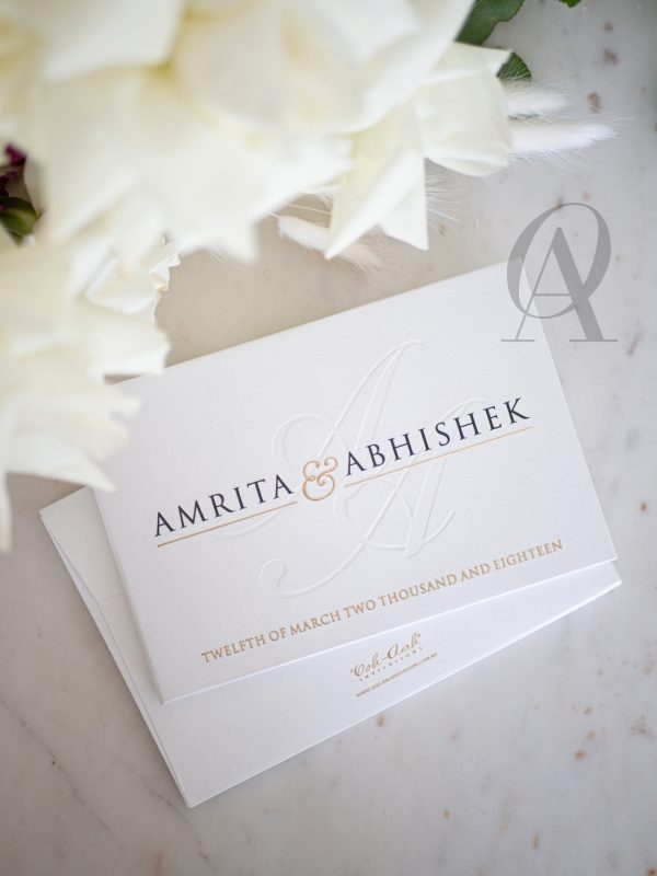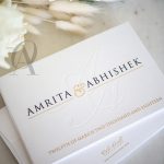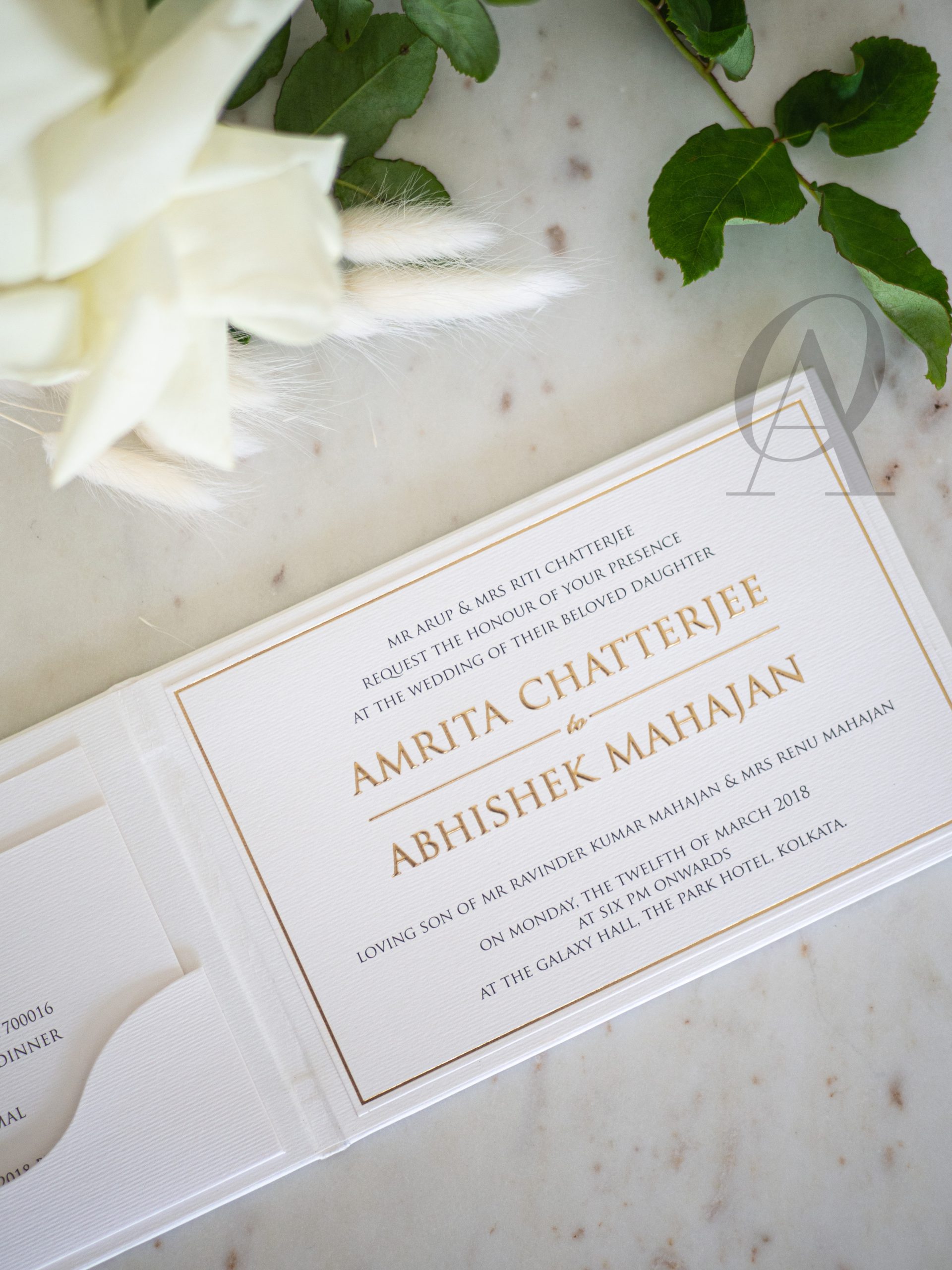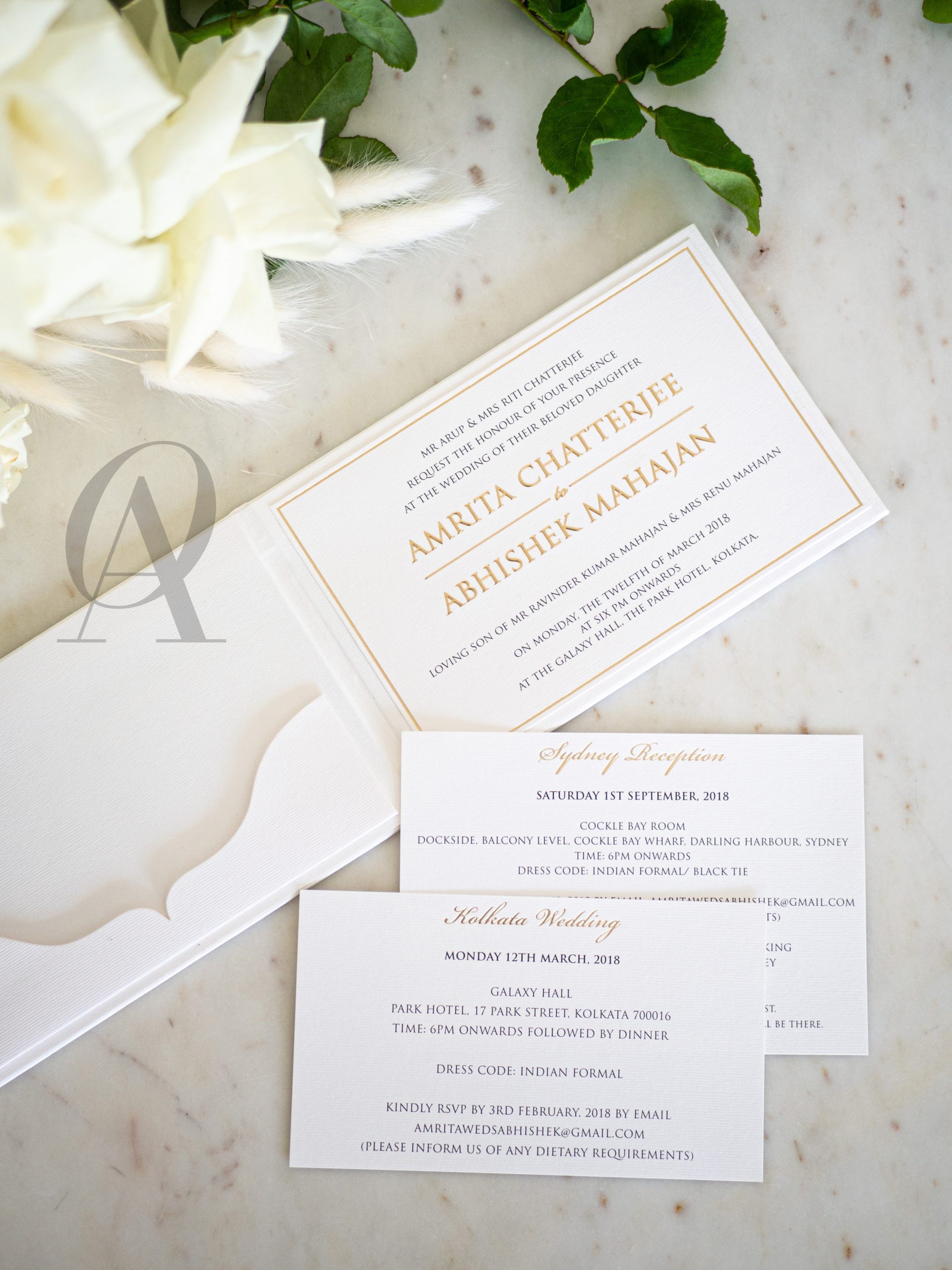 – Hardcover invitation book design embossed with your names in black and wedding date in gold foil.