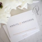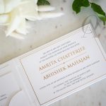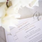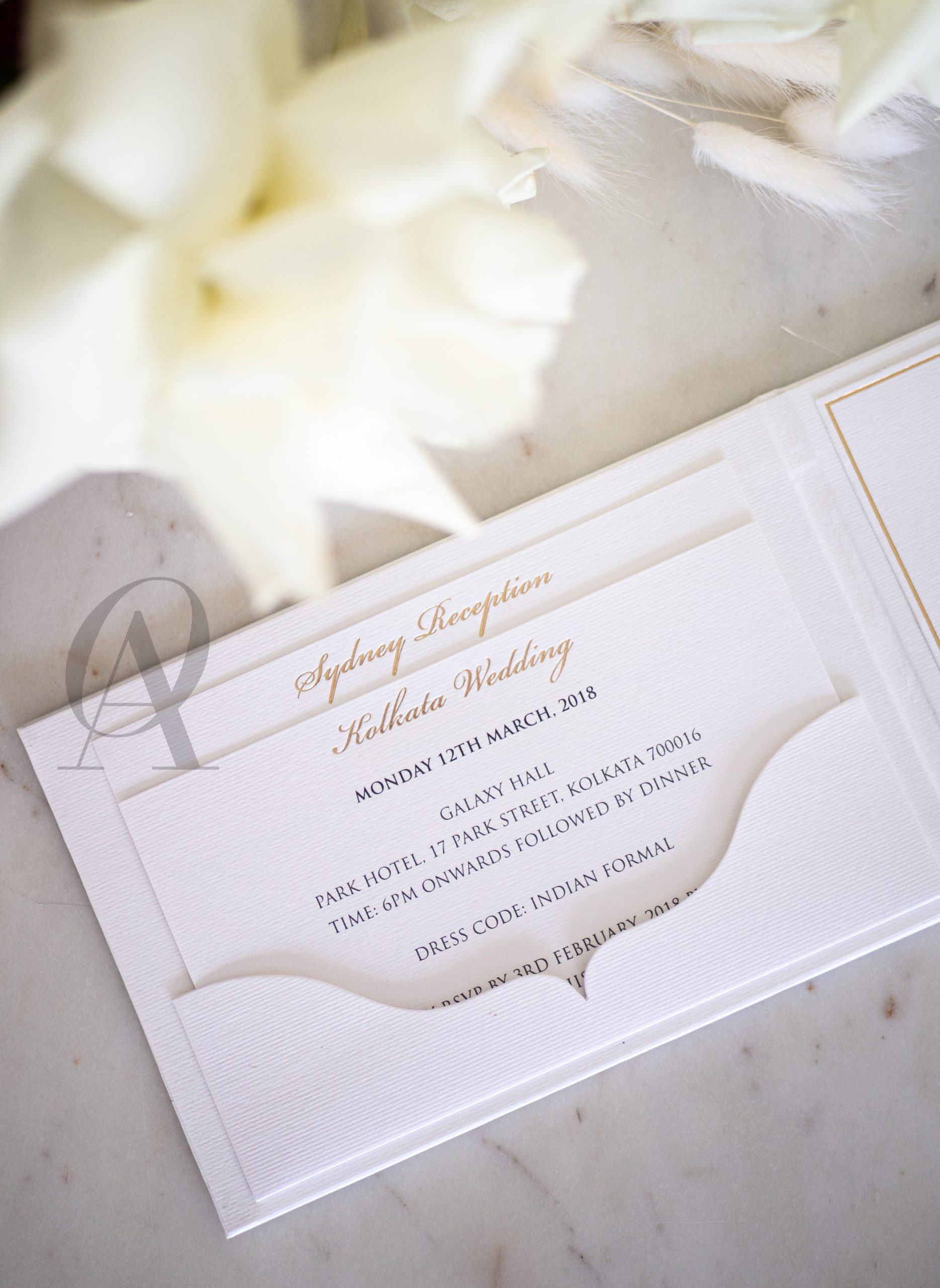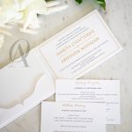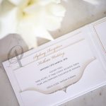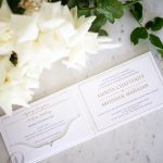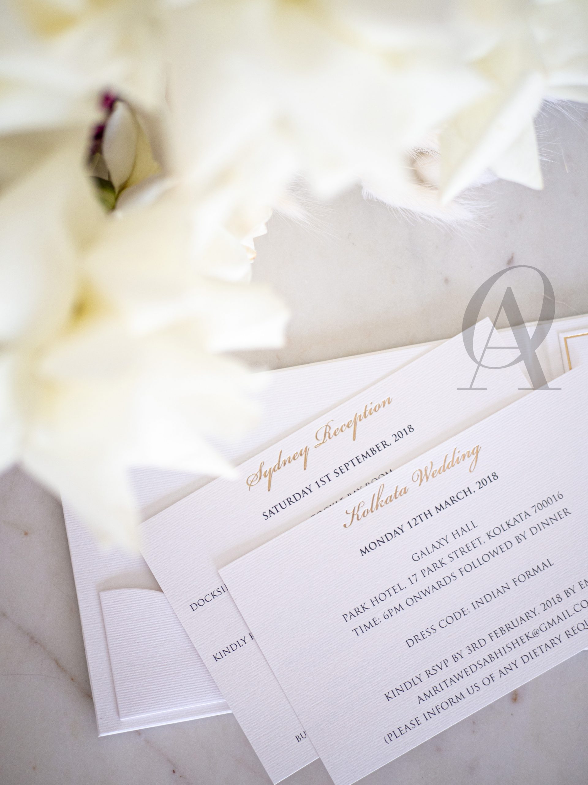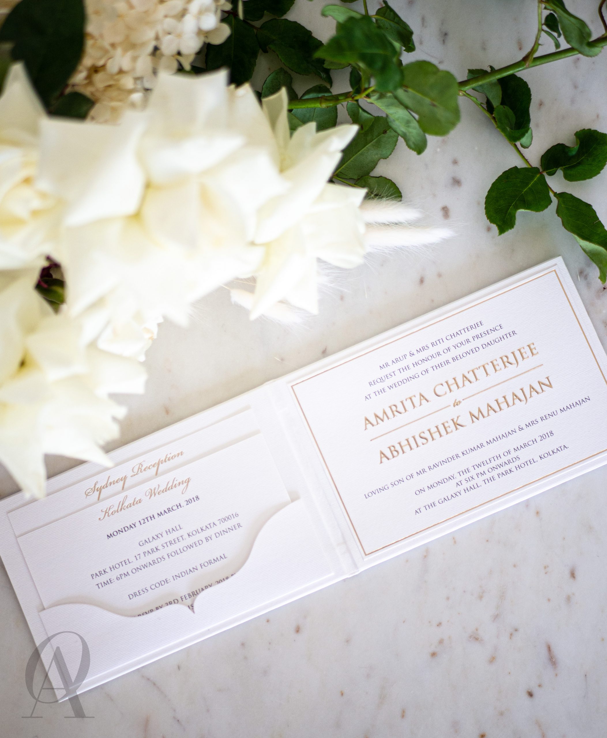 – Hardcover invitation book design embossed with your names in black and wedding date in gold foil.