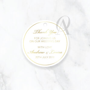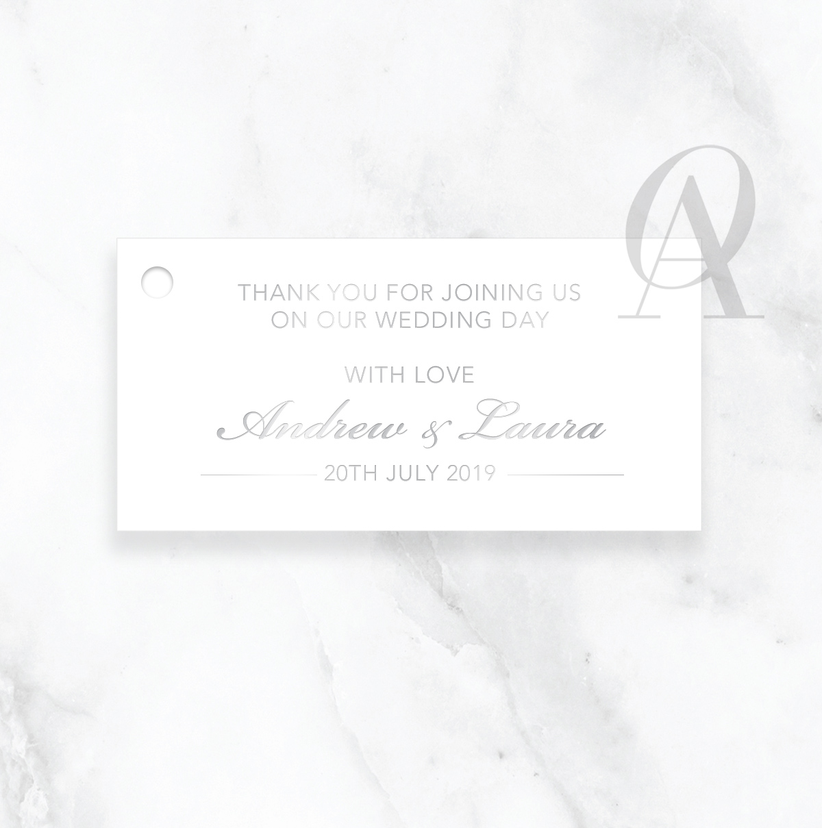 Express your gratitude with simple and elegant wedding thank you tags in silver foil. The thank you tags are pre-punched and ready to use on your wedding favours and bombonieres.