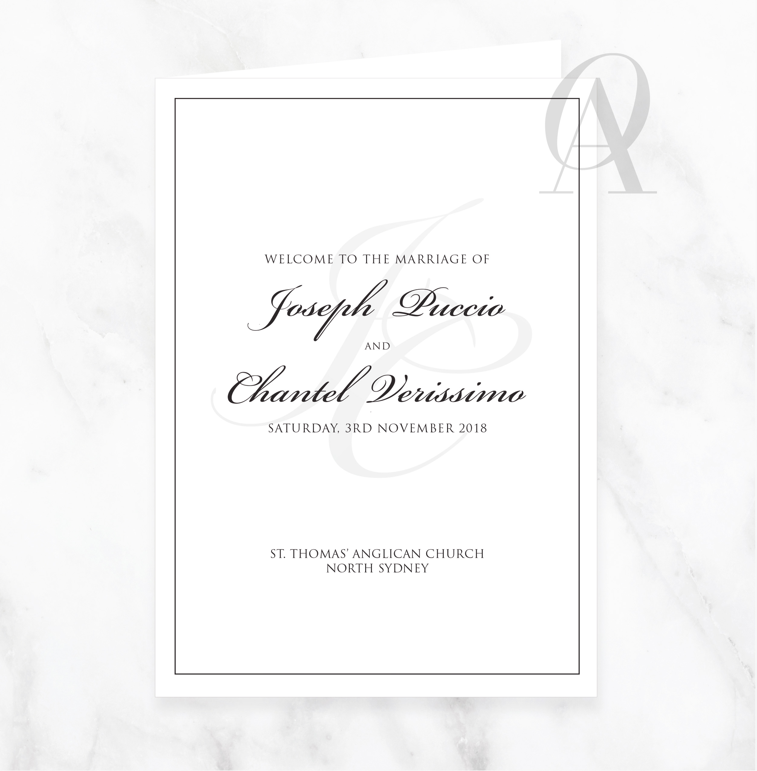 Personalise your church booklets / order of service booklets / wedding programs with a simple and classic design that includes your initials, names, wedding date and venue. A thoughtfully designed cover will create a beautiful way to share the sequence of events and wedding ceremony traditions with your guests.