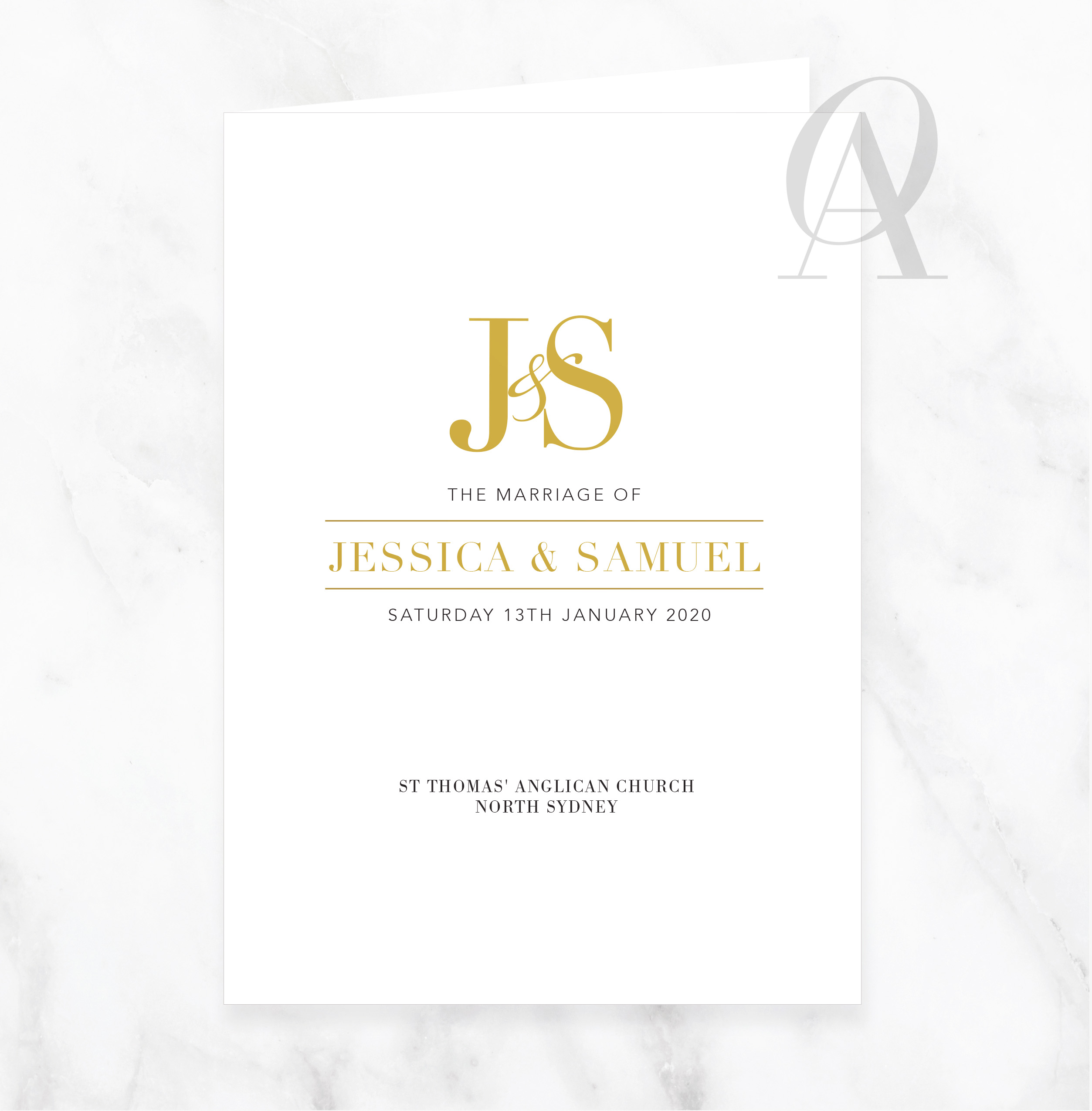 Personalise your church booklets / order of service booklets / wedding programs with a simple and classic design that includes your initials, names, wedding date and venue. A thoughtfully designed cover will create a beautiful way to share the sequence of events and wedding ceremony traditions with your guests.