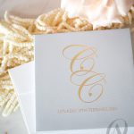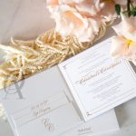 Luxury grey and gold wedding invitations are perfect for the couple who loves elegant glamour. Your monogram stands centre stage on this hardcover wedding invitation design in a glorious embossed gold foil finish. This sophisticated wedding invitation is complete with a stylish pocket to hold your cards neatly. Gold foil throughout the internal layout is an impressive addition that displays class and beauty your family and friends will never forget.
