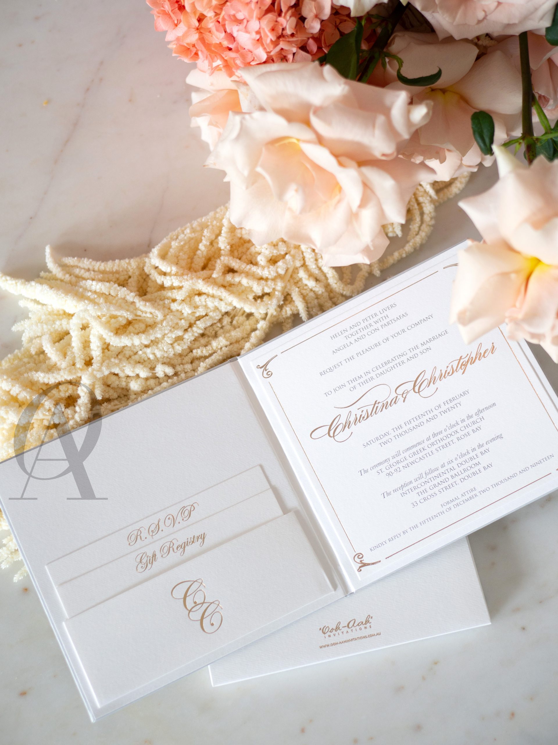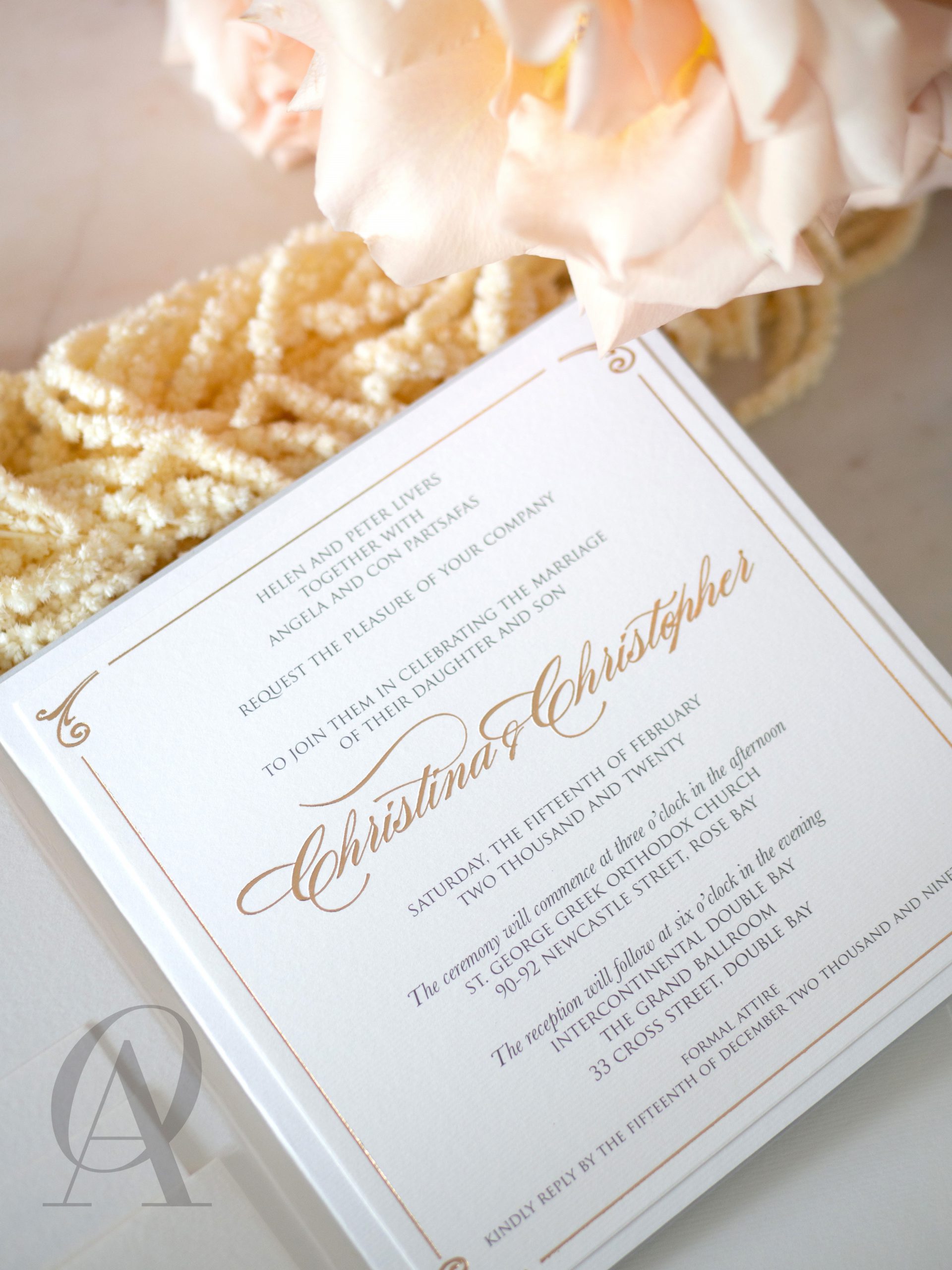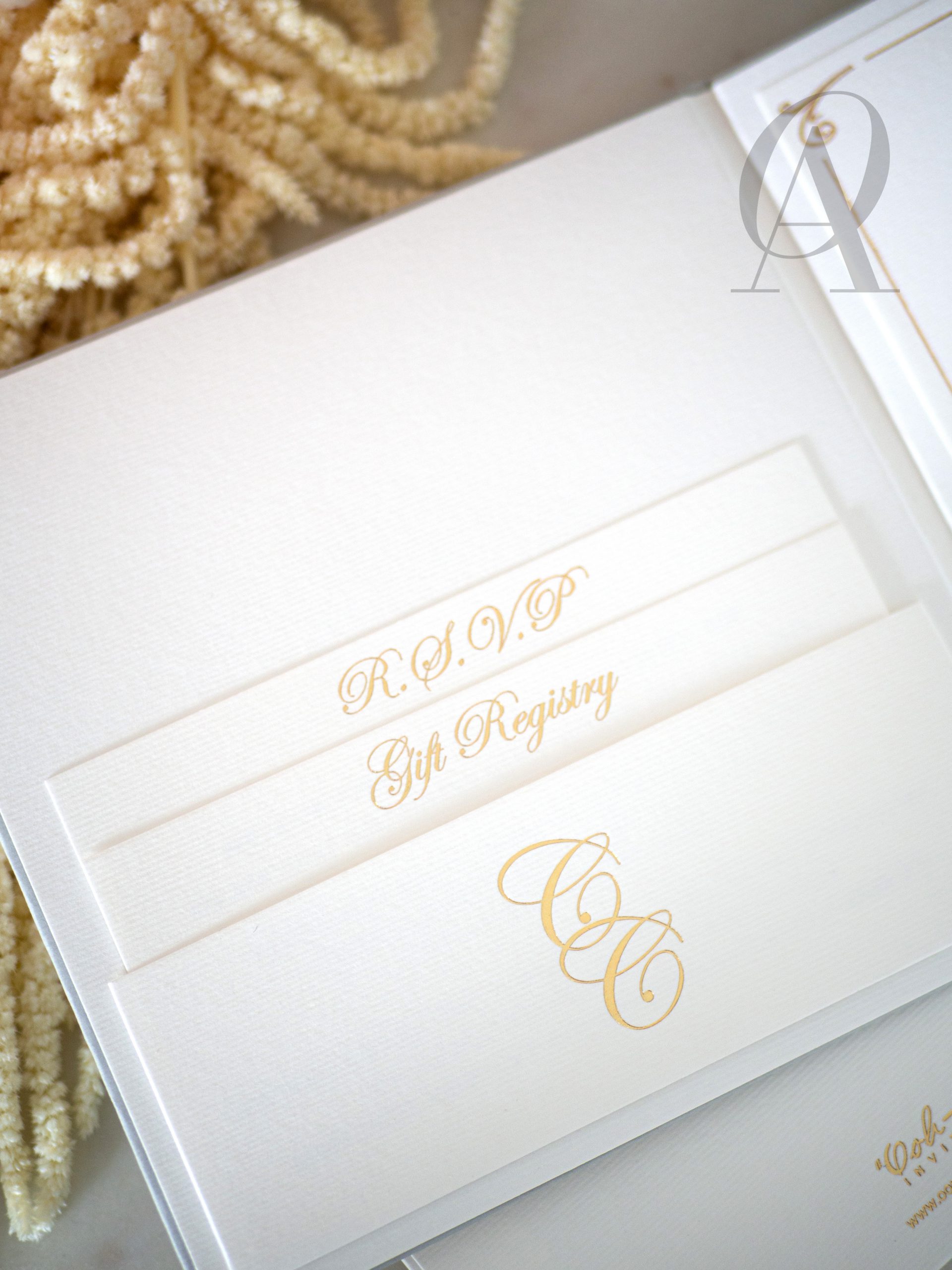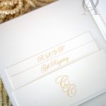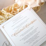 – Internal invitation page printed with your names and a border in gold foil.
