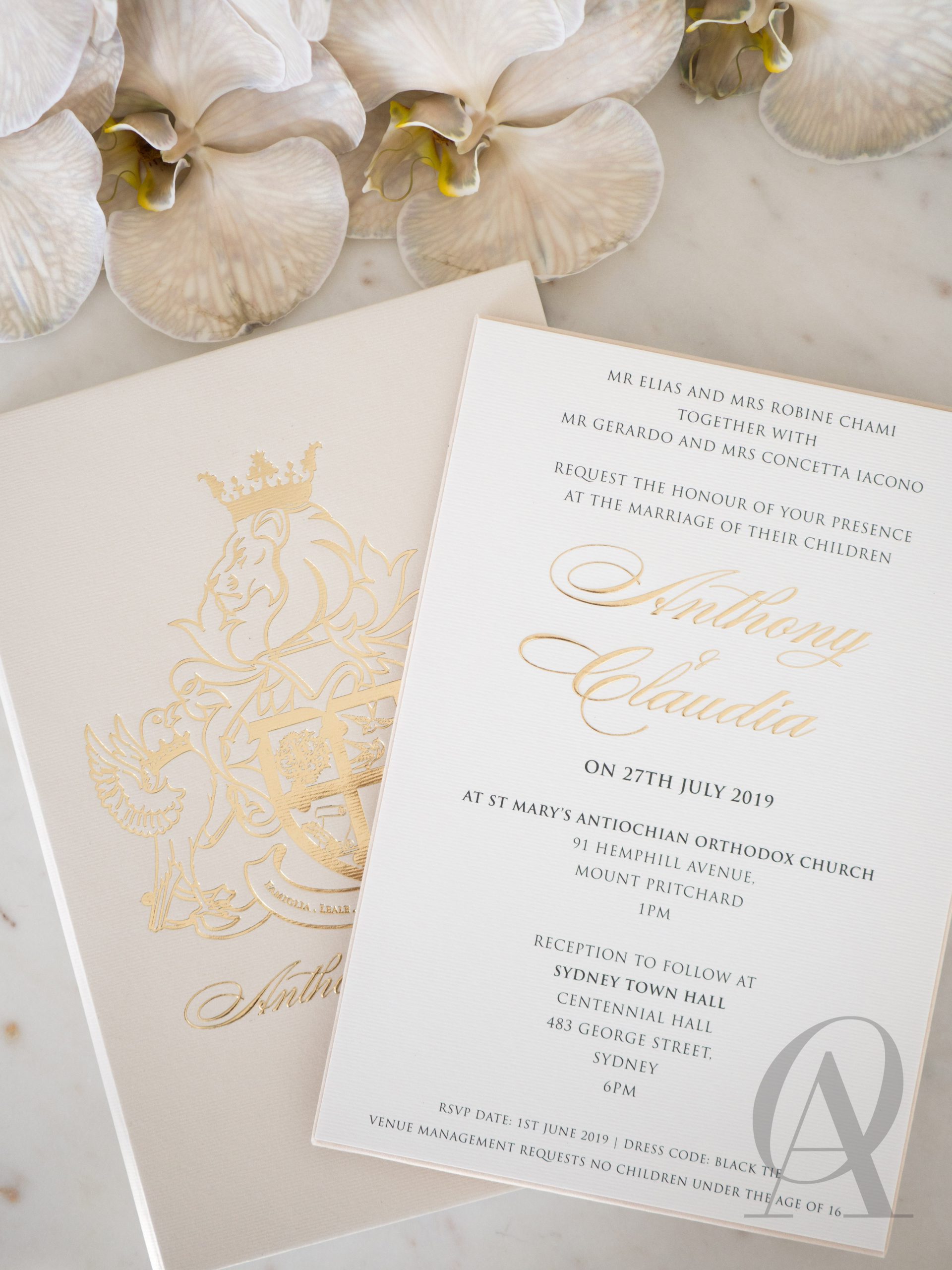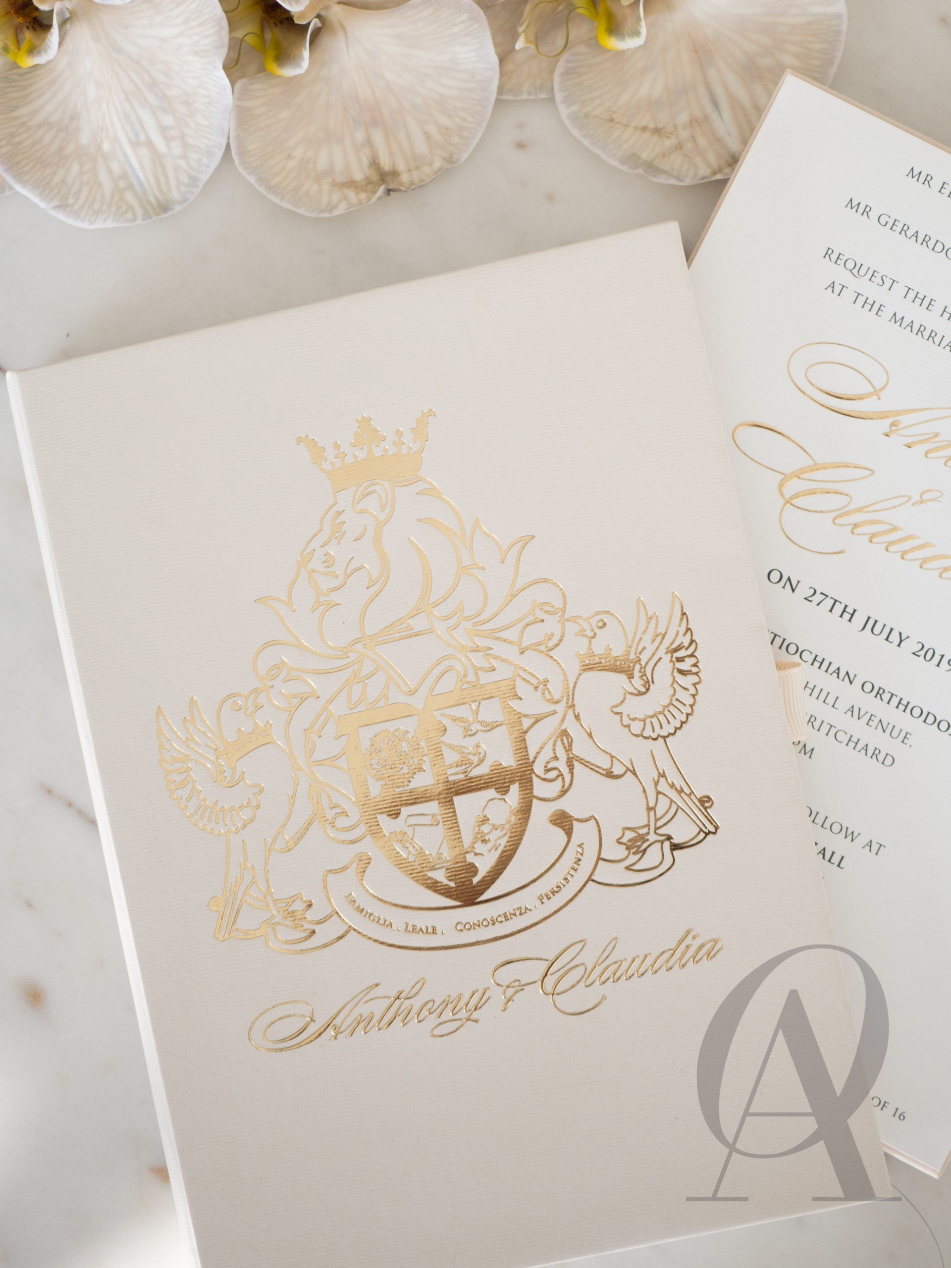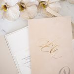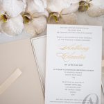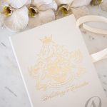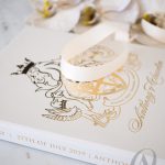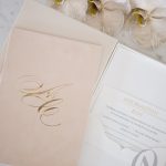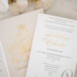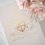 Luxury boxed wedding invitations with soft neutral tones and gold foil highlights will gracefully express the grandeur and charm of your wedding. Nude, champagne, ivory and gold are a luxurious mix of colours that fits perfectly with this glorious regal crest designed for the bride and groom. A delightful blend of textures creates an intriguing contrast and an exquisite sensation. You’ll discover a luxe ribbed surface throughout the design, and soft European suede in a champagne tone covering half the exterior of the main wedding invitation made with a premium rigid board. glamorous gold foil embellish our signature detailing, leaving your guests to admire this magnificent design for years to come.