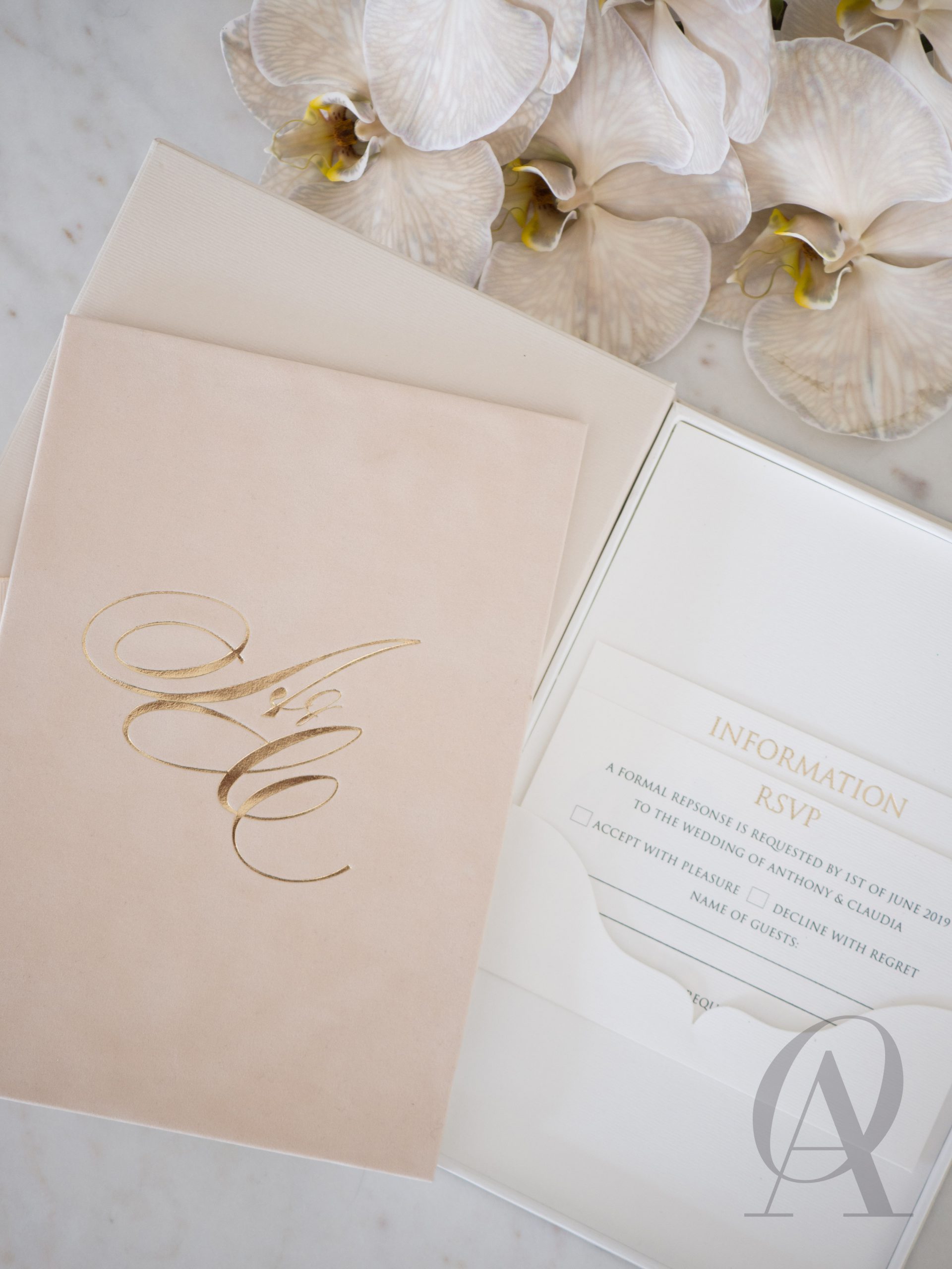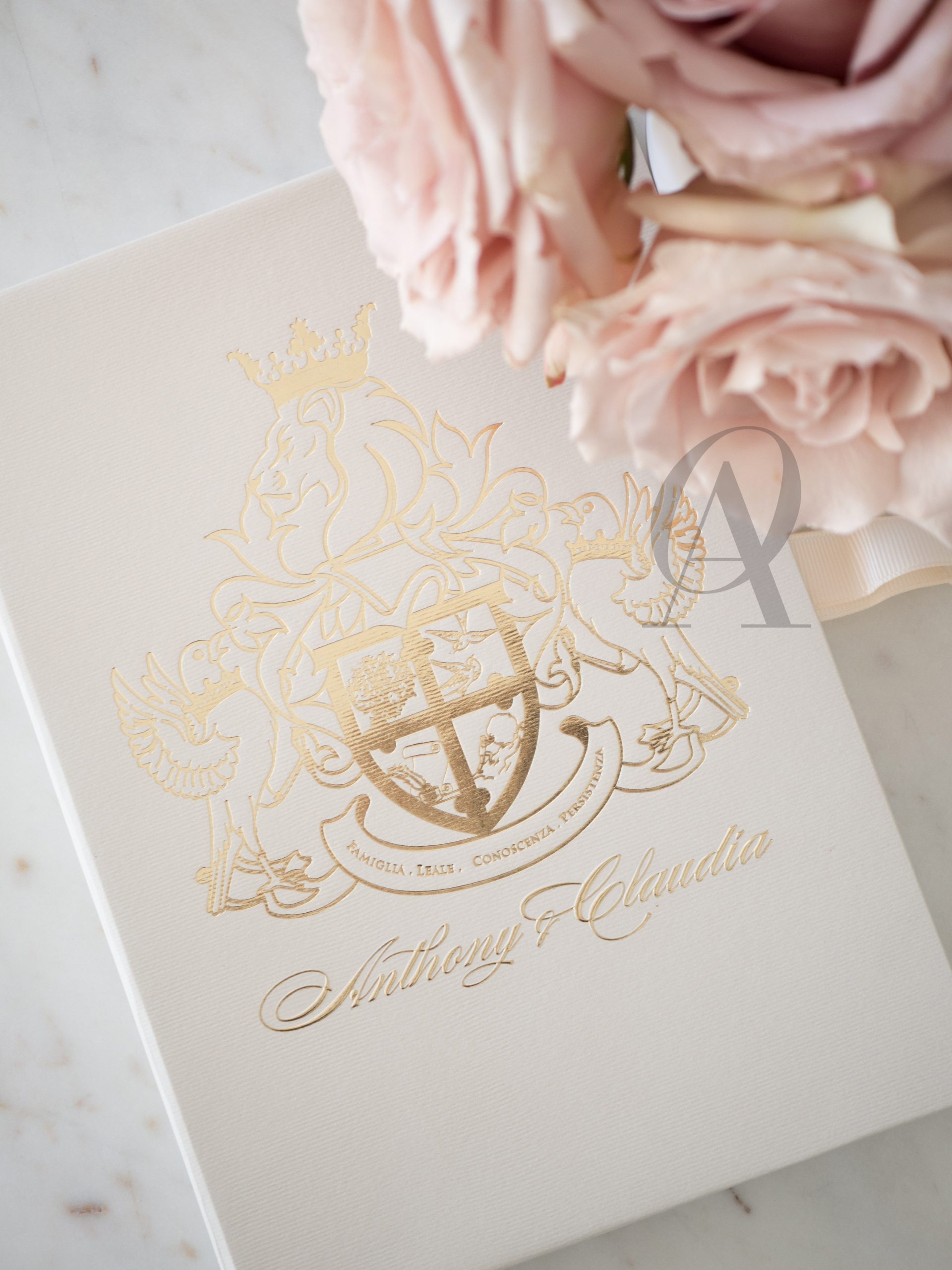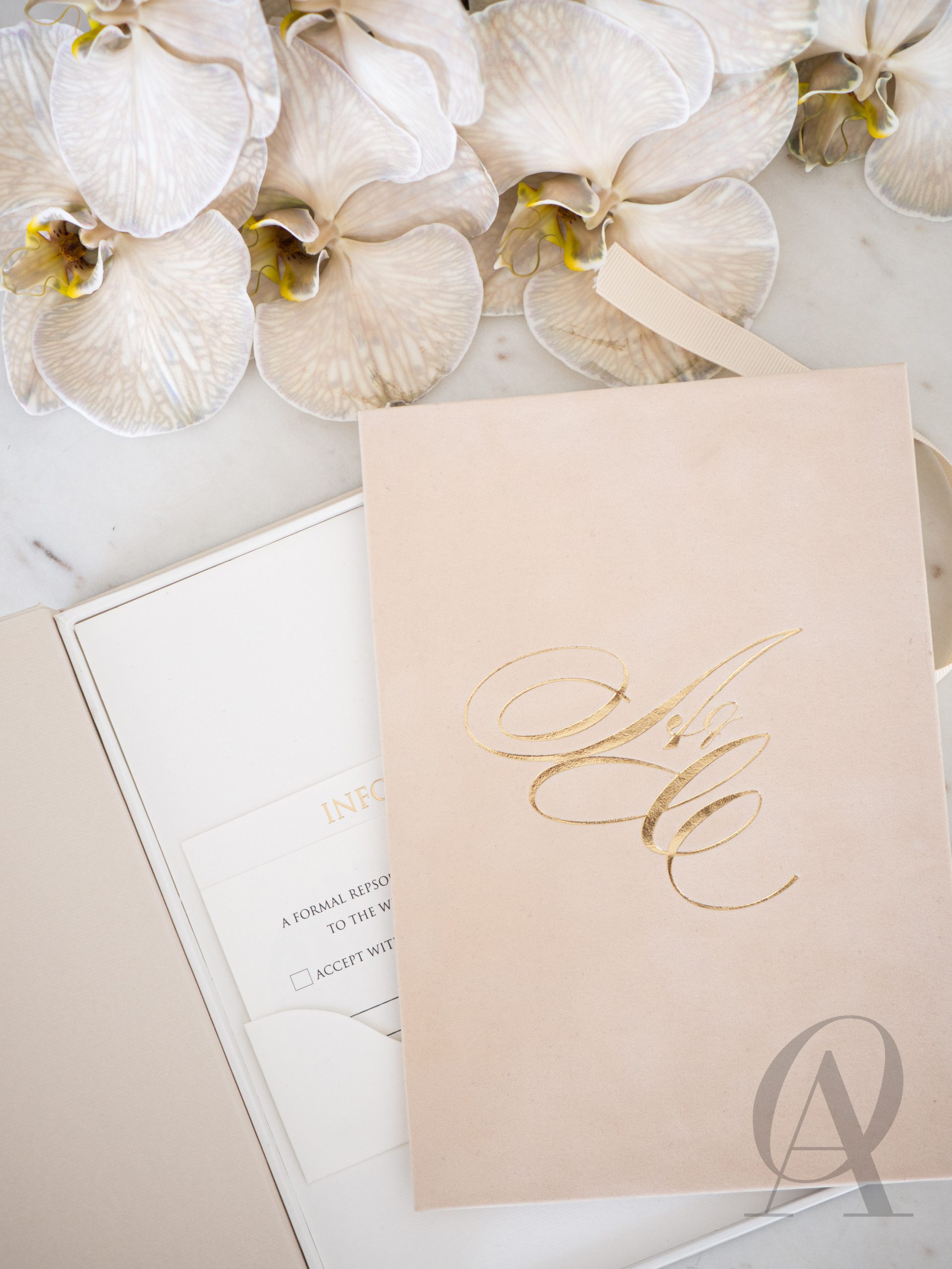 – Luxe nude coloured box with a custom monogram design in gold foil.