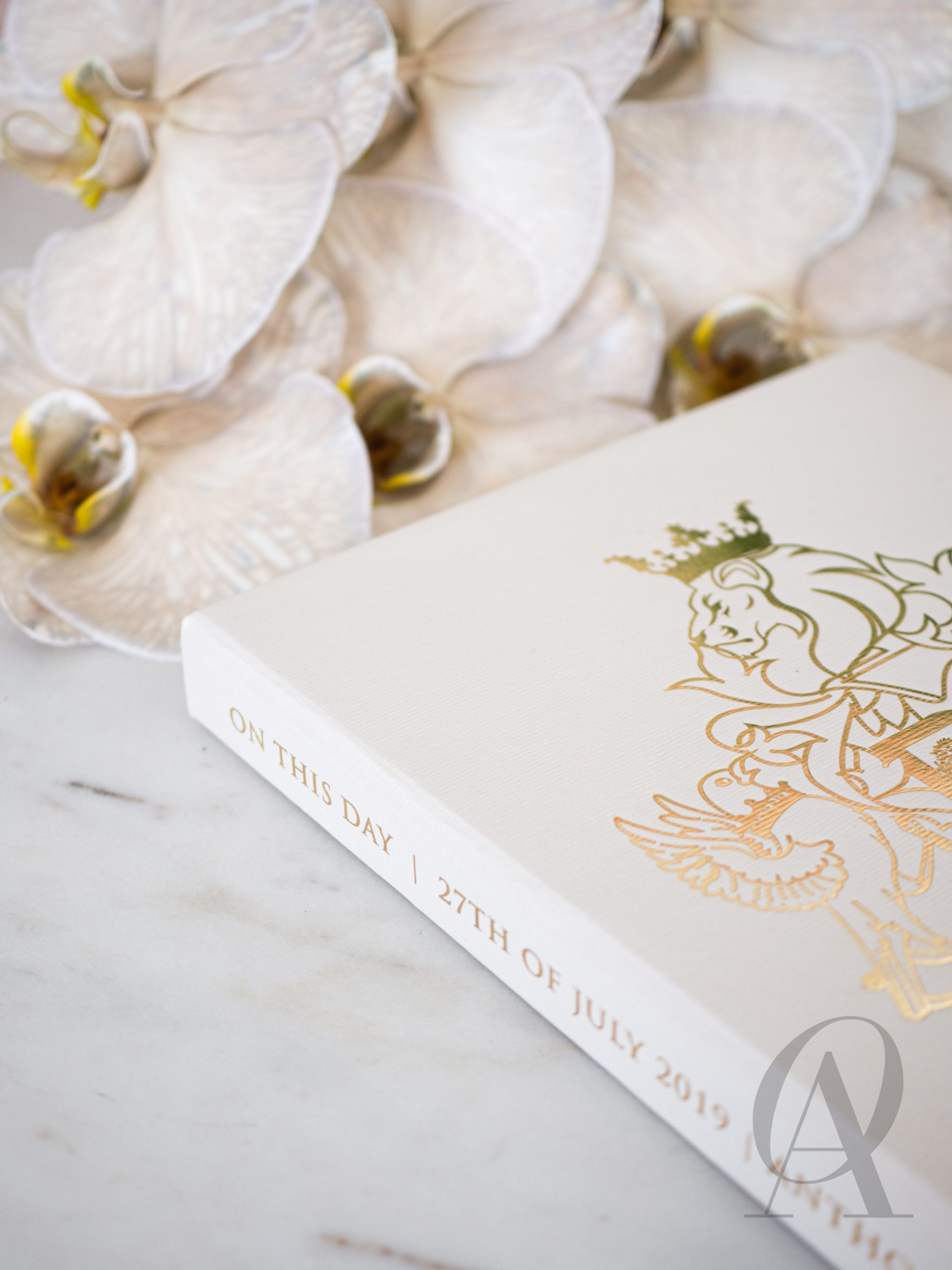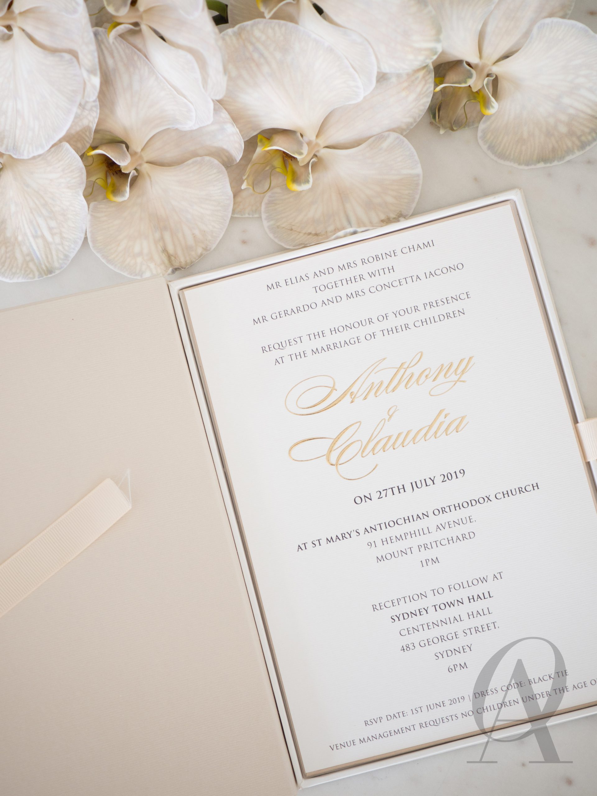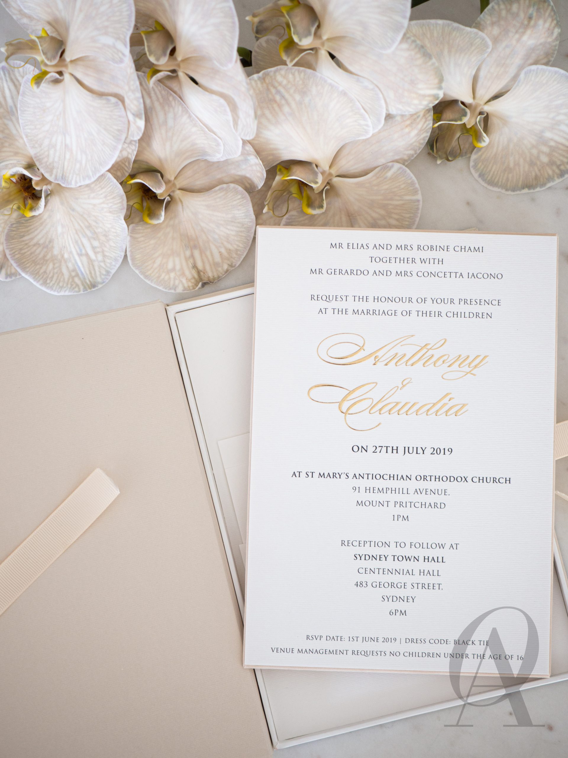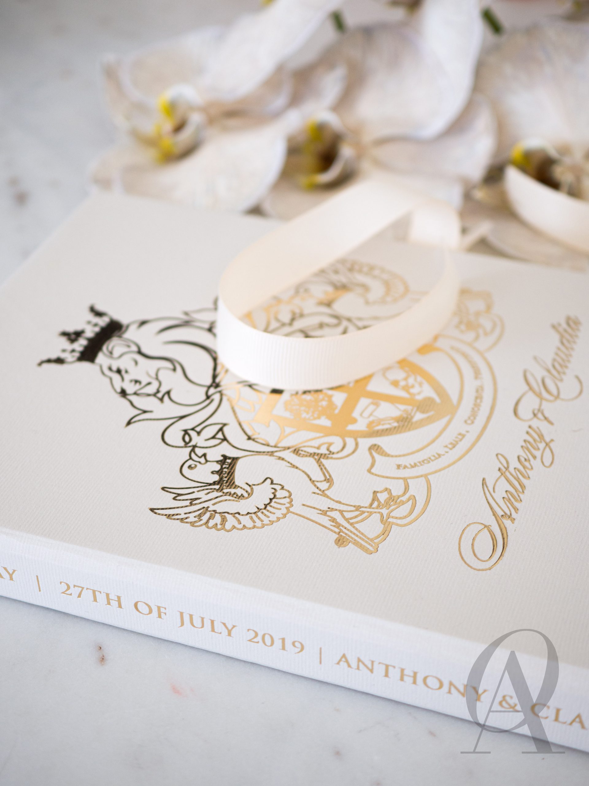 – Luxe nude coloured box with a custom monogram design in gold foil.