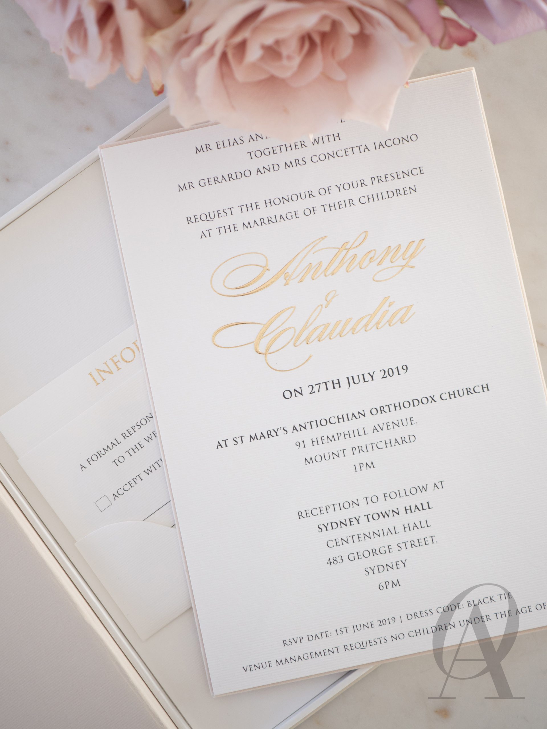 – Wedding details elegantly designed on the reverse side with your names in a gold foil.