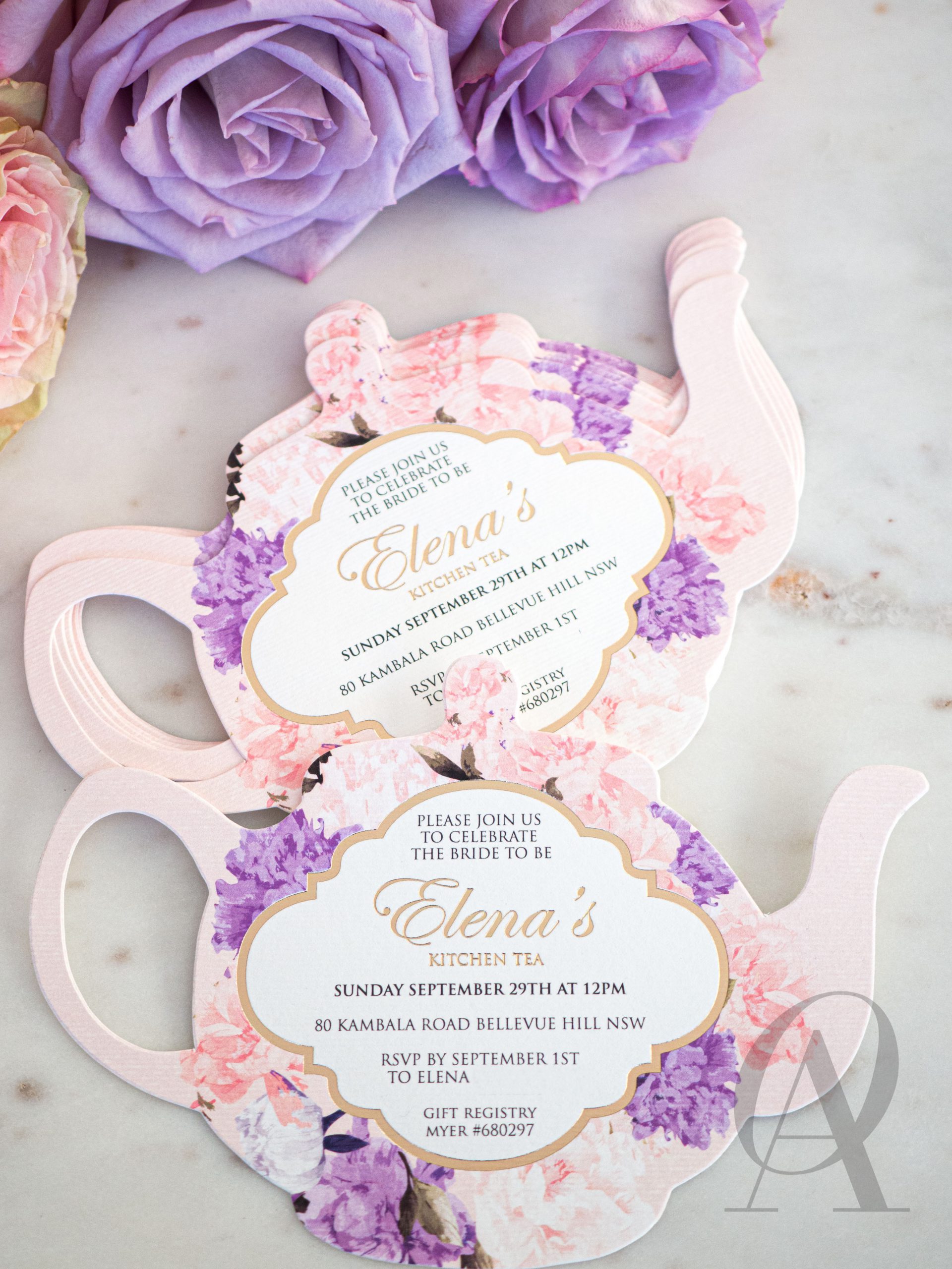 Purple Pink Florals Teapot Bridal Shower Invitations Kitchen Tea