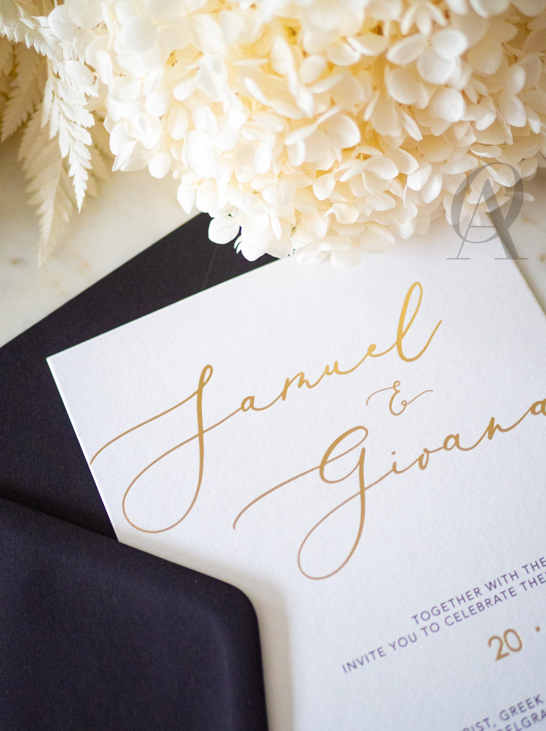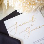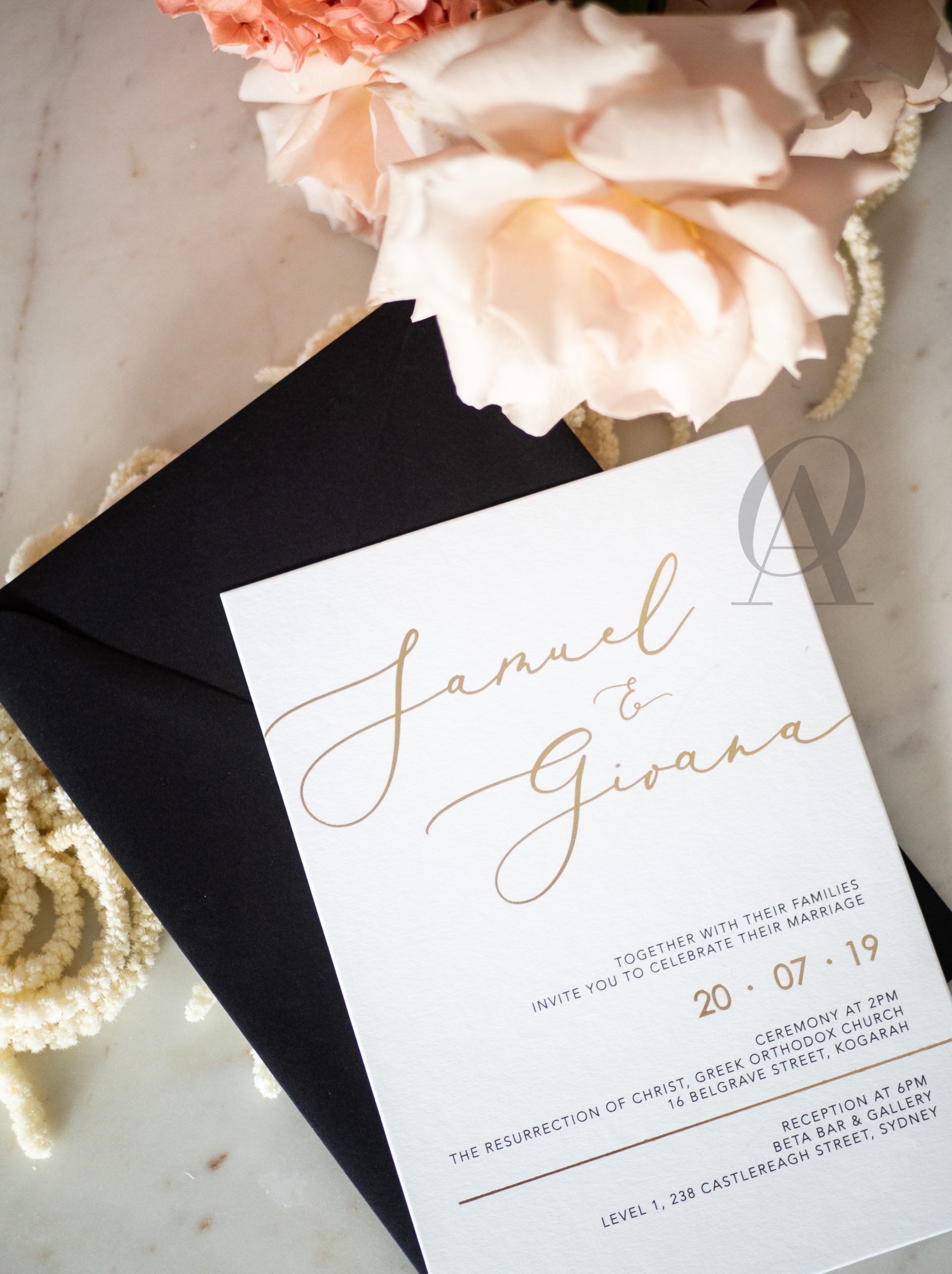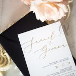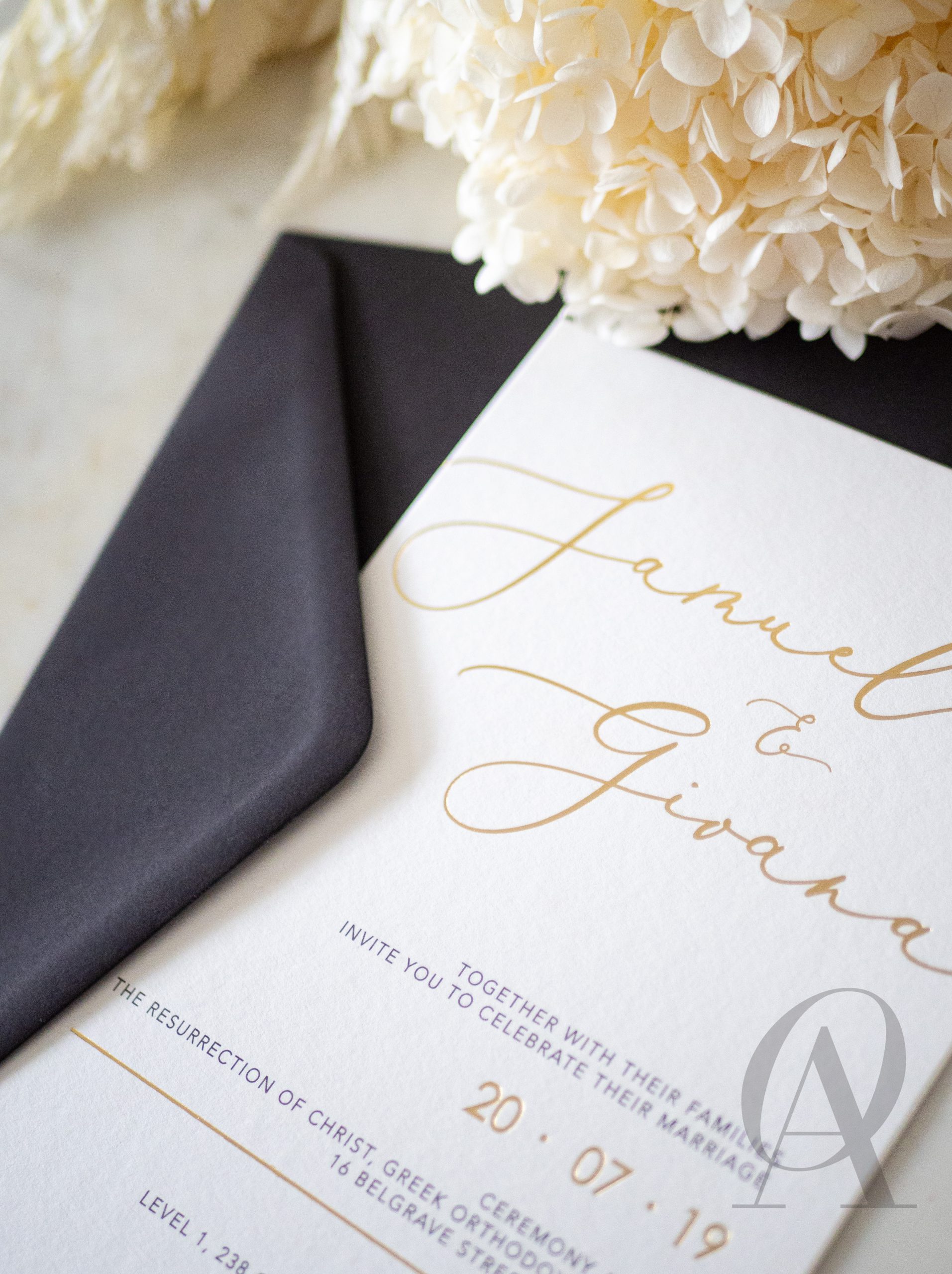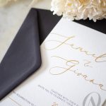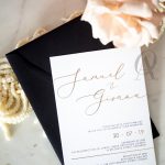 Modern wedding invitations will give your guests a taste of the sophisticated elegance they can expect at your wedding. The simplicity of this design is ideal for any bride and groom looking for a timeless and stylish wedding invitation. Luxuriously thick textured card, flowing calligraphy font and touches of gold foil add a sense of luxury and class.
