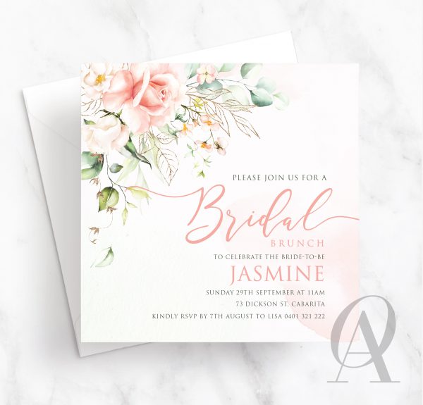 Floral bridal shower invitations are perfect for a garden bridal shower or an elegant kitchen tea party. This stunning arrangement of roses in pastel green and blush tones will set the tone for a classy and delightful celebration. A delicate outline of gold florals adds a little sparkle and glamour.
