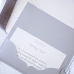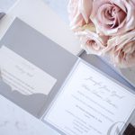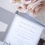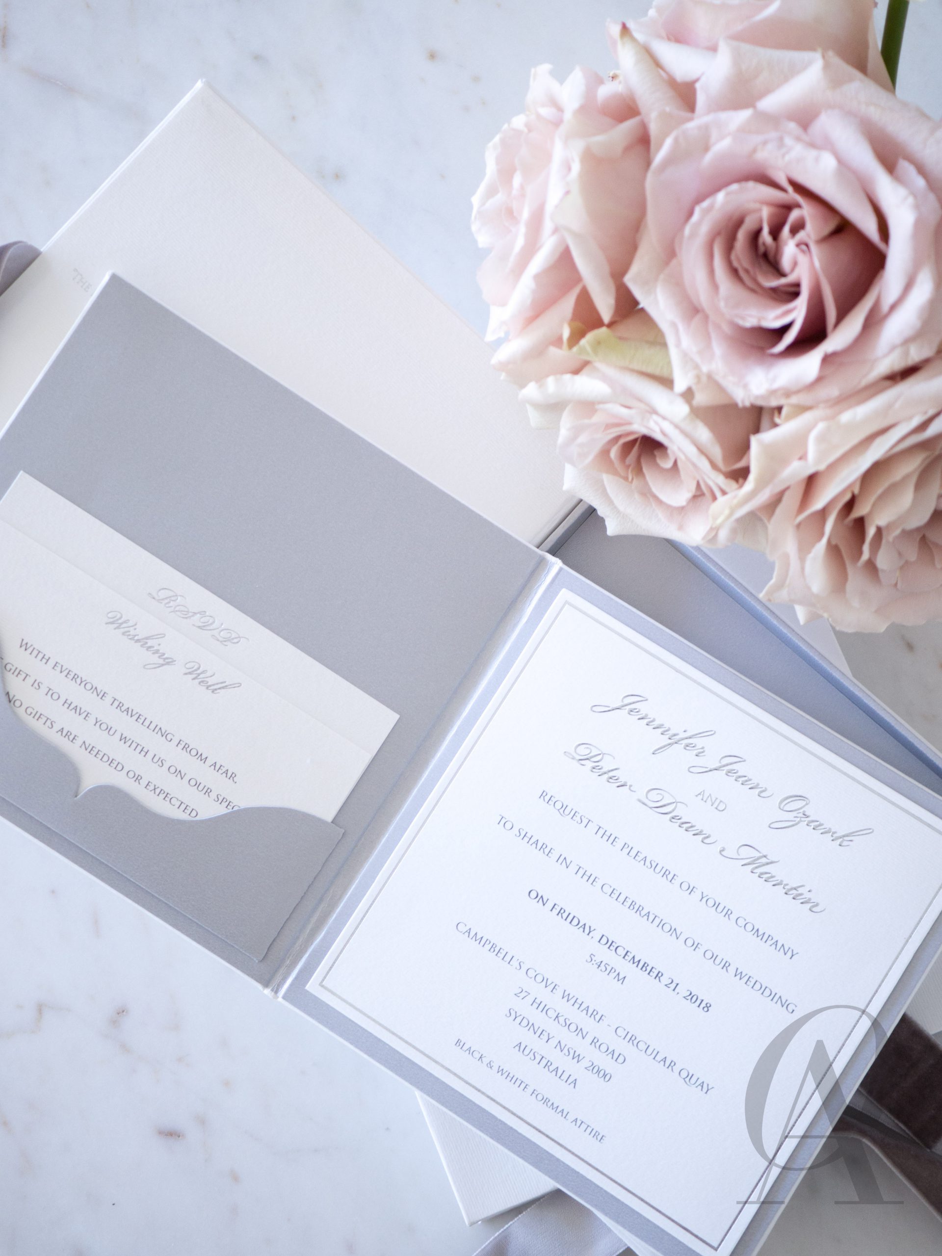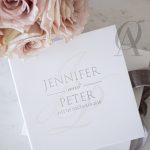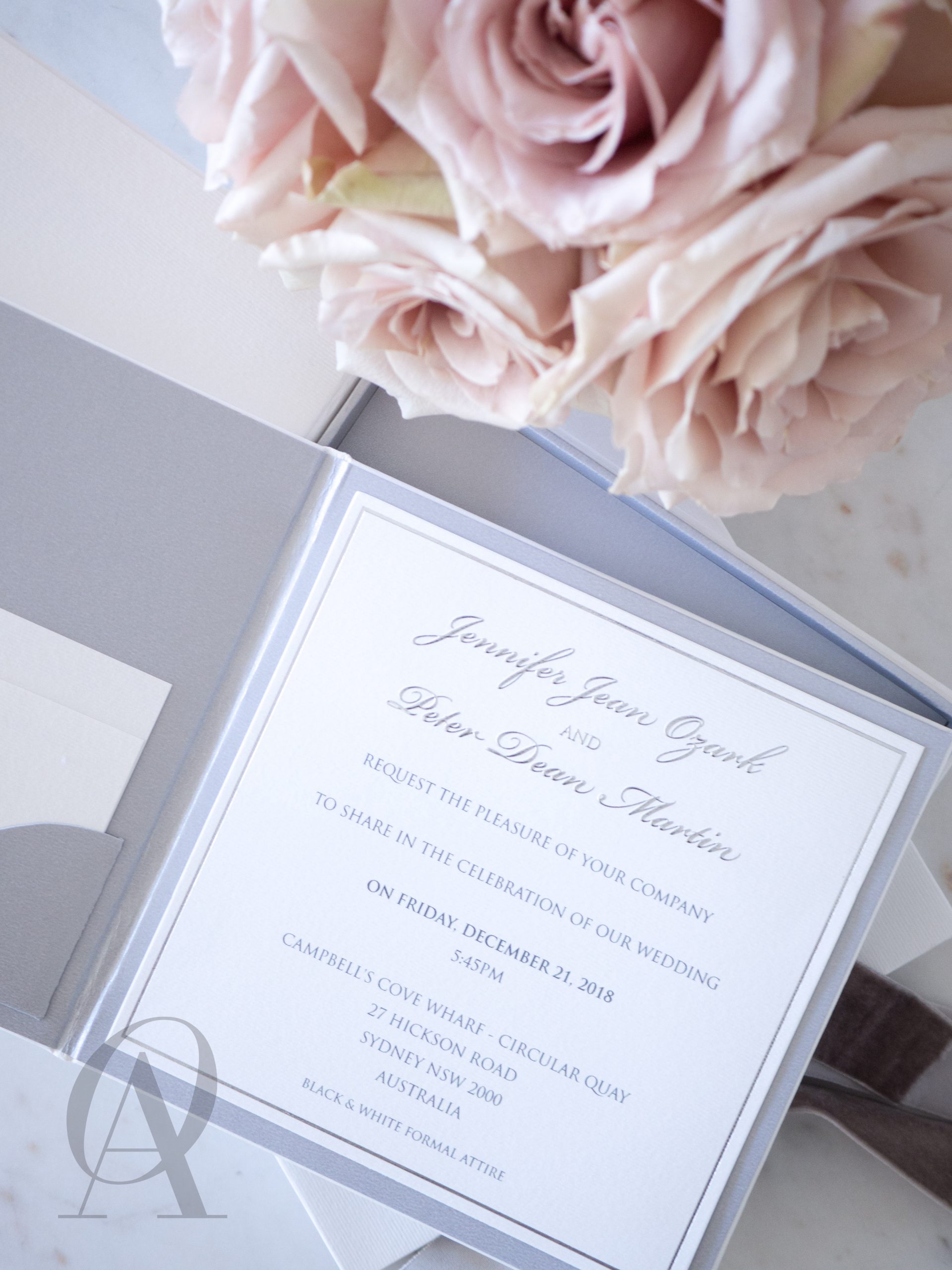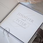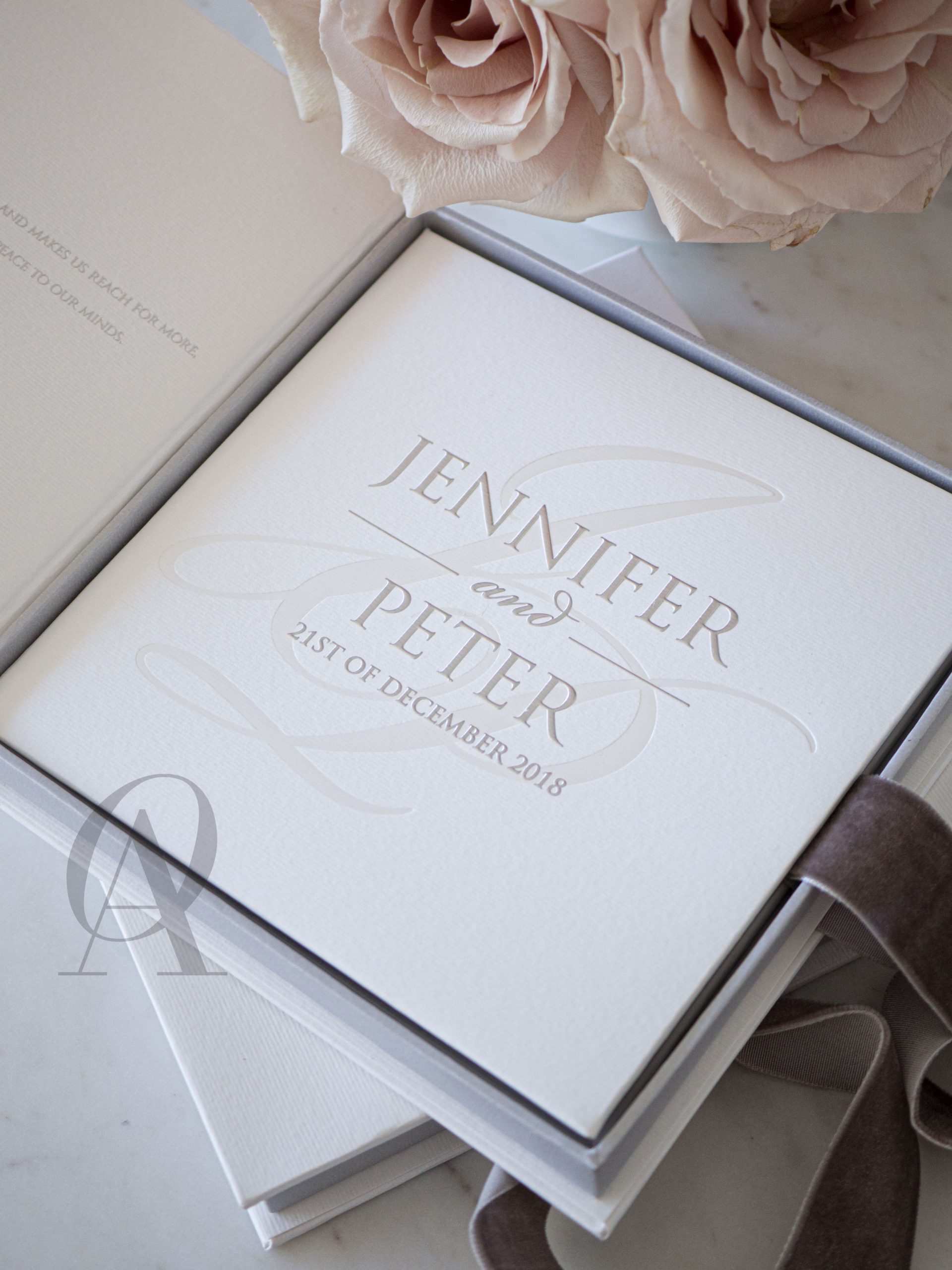 – Your names and wedding date embossed in silver foil over your initials in pearl foil.