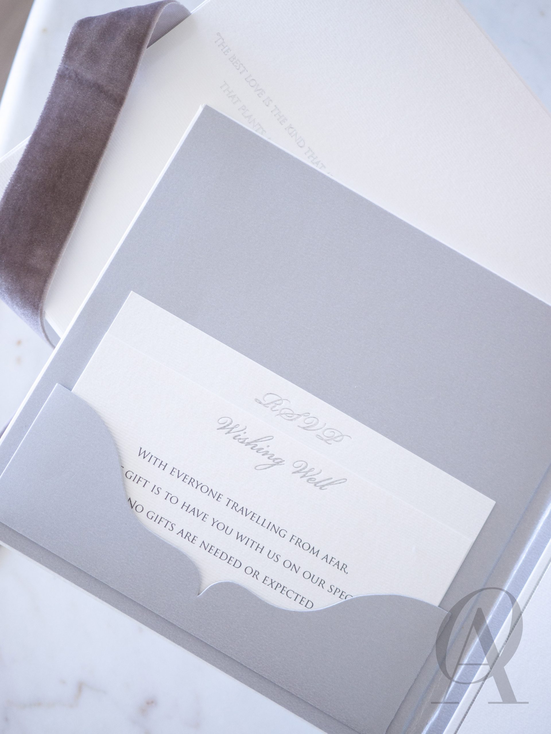 – Insert cards (RSVP, Information or Wishing Well) with headings and borders in silver foil for a stylish finish.