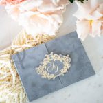 – Trifold hardcover invitation design with grey European suede.