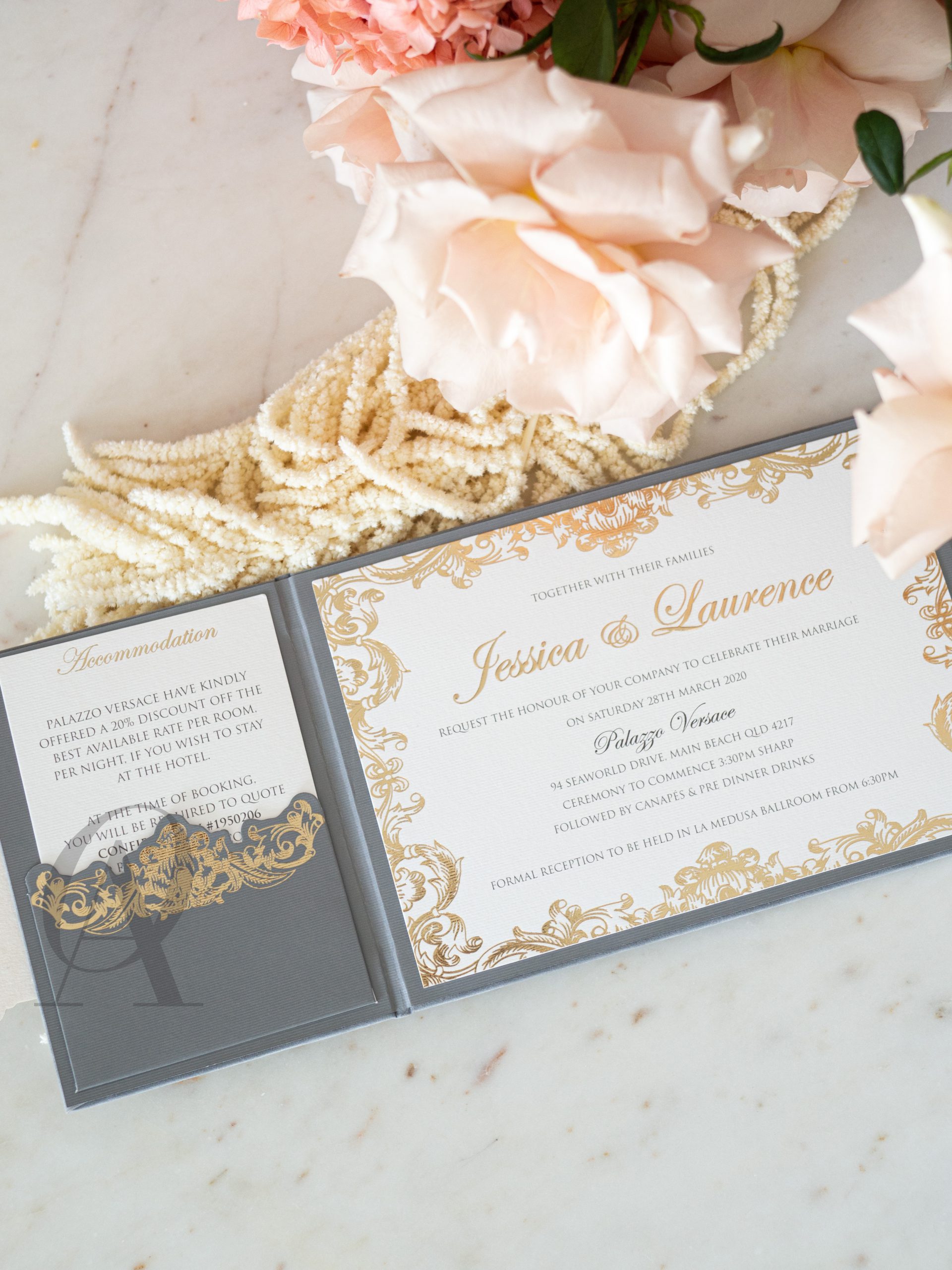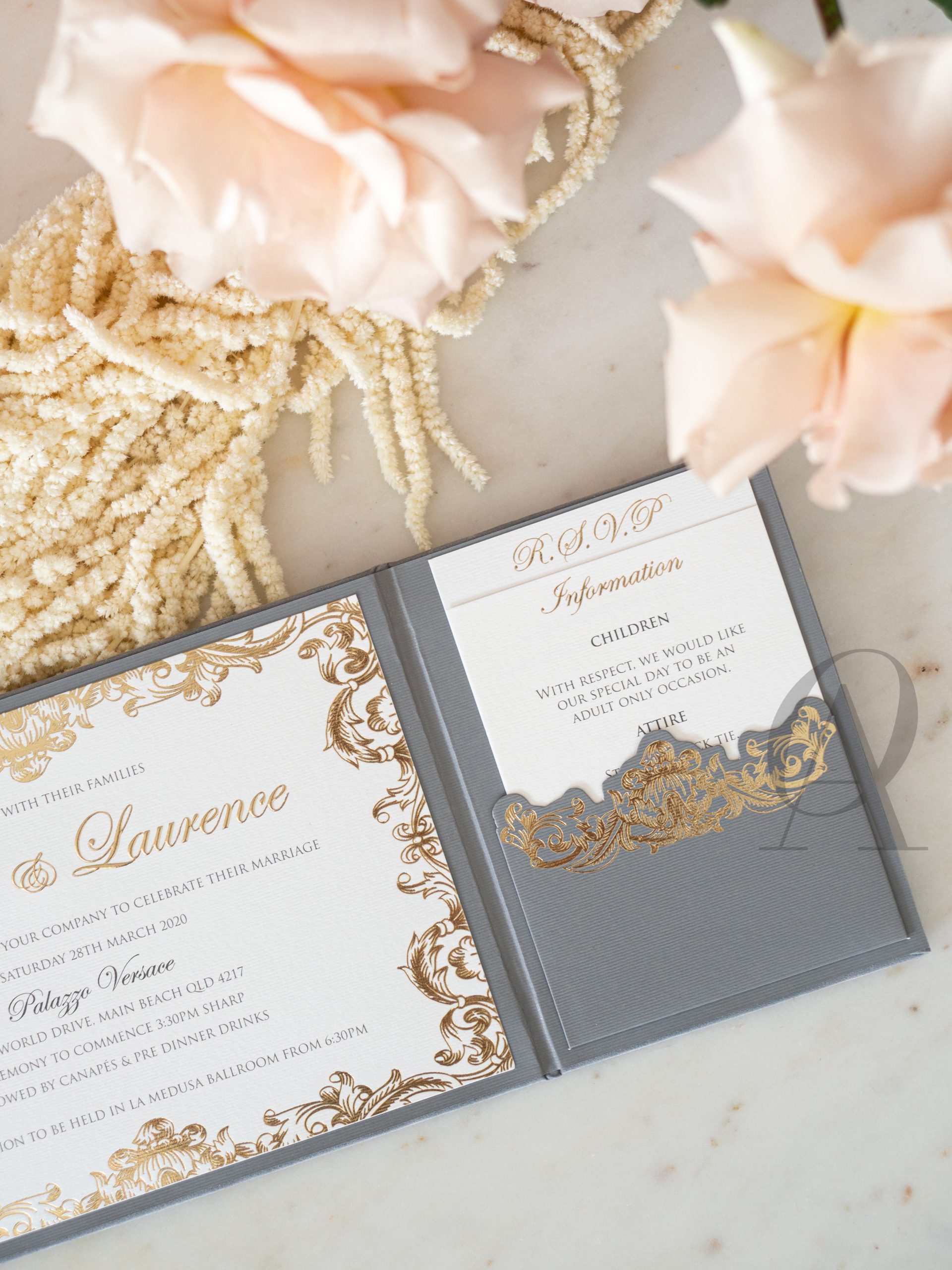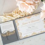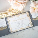 Mesmerise your family and friends with a trifold wedding invitation created with a luxurious combination of suede and gold foil. Grey and gold is a trendy and timeless colour scheme that works magically on a regal and baroque design. The abundance of ornate and exquisite line work on sensuous suede creates a stunning impression of grandeur.