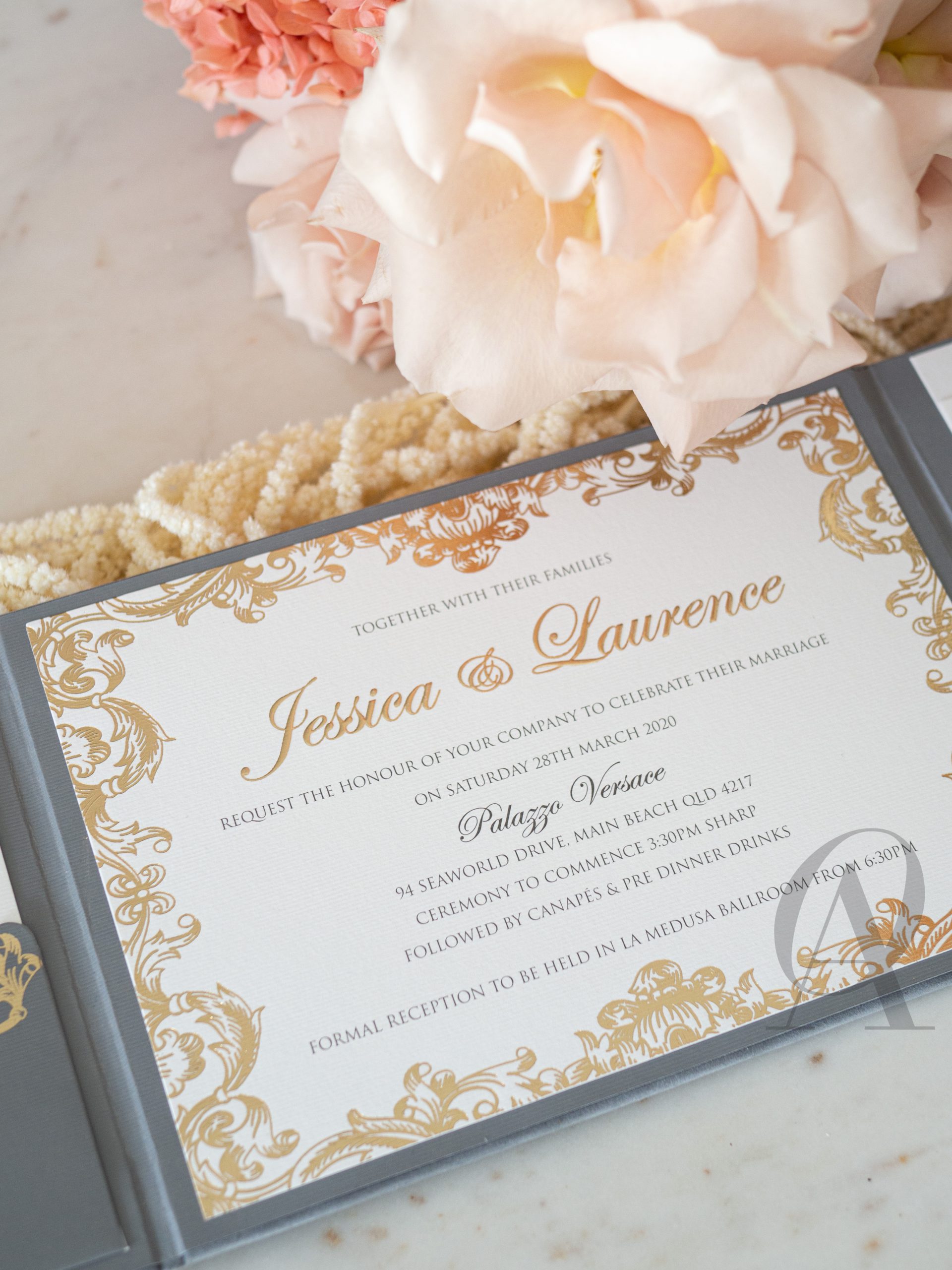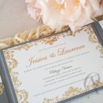 – Internal invitation page printed with your names and a border in gold foil.