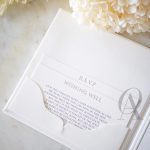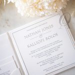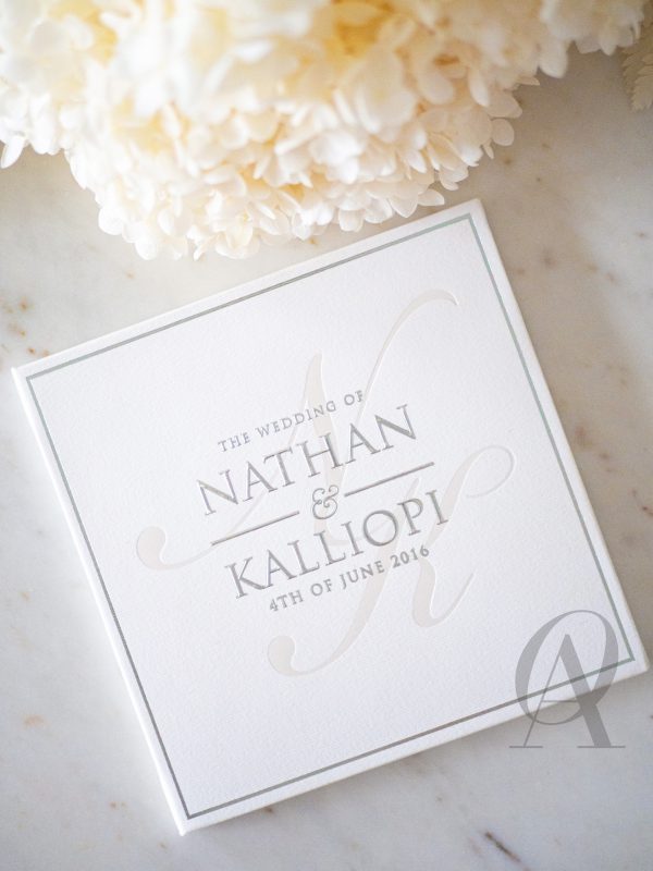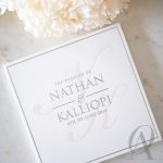 White and silver wedding invitations are currently trending. We’ve elevated this elegant combination by substituting white with ivory. The luxurious shade of ivory, as seen on this hardcover wedding invitation, exudes elegance and makes a beautiful background to radiate silver foil. This simple and elegant design has everything the stylish and modern couple could want in their wedding invitations. Beautiful embossed silver foil adorns the sophisticated and clean layout with understated and timeless font styles. The background displays a wedding monogram created with your initials in a pearlescent foil. The two layers of foil is our signature finish we created in 2007 and is still loved by many couples until this very day.
