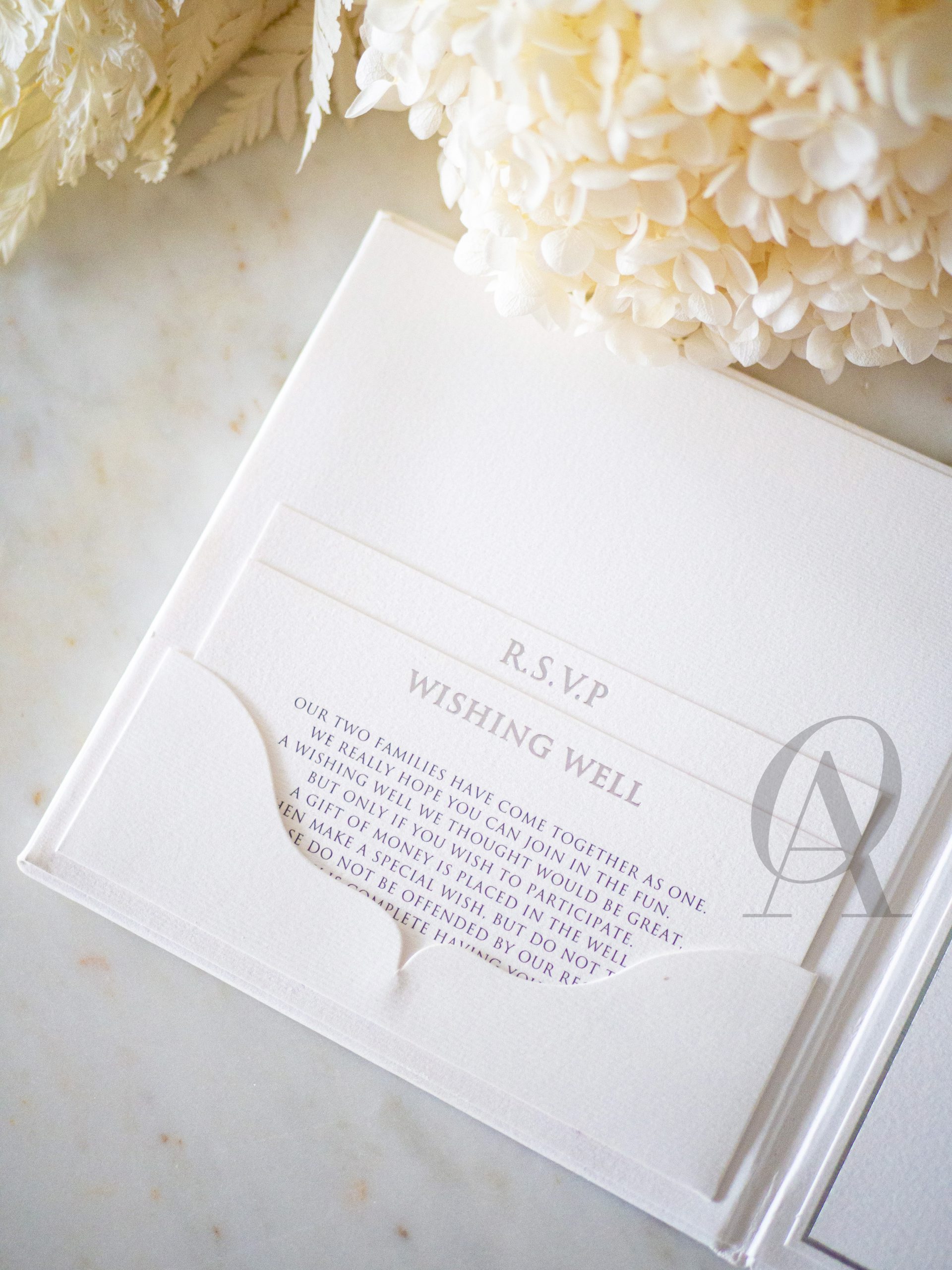 – Die cut pocket to hold insert cards neatly (RSVP, Information or Wishing Well).