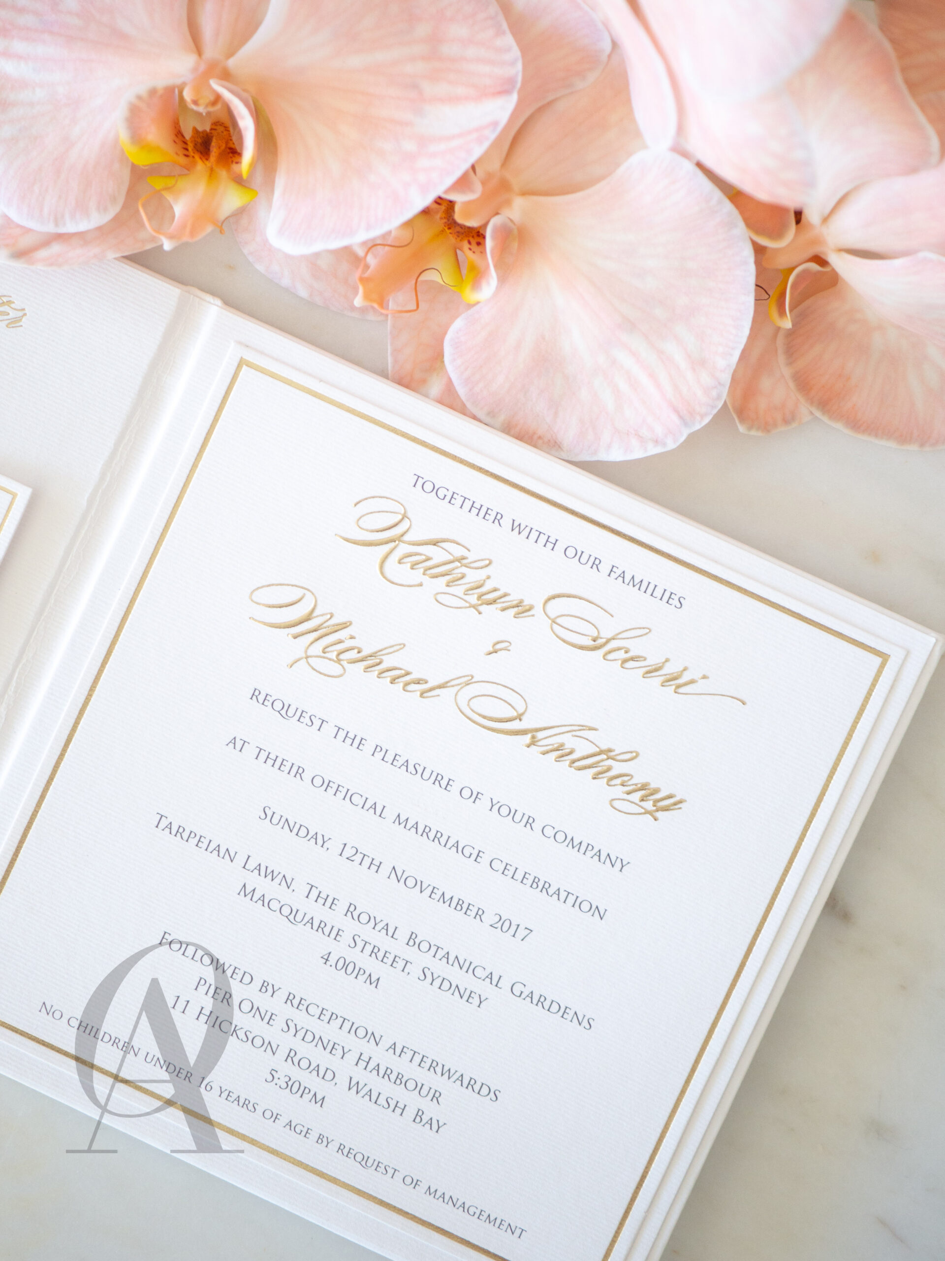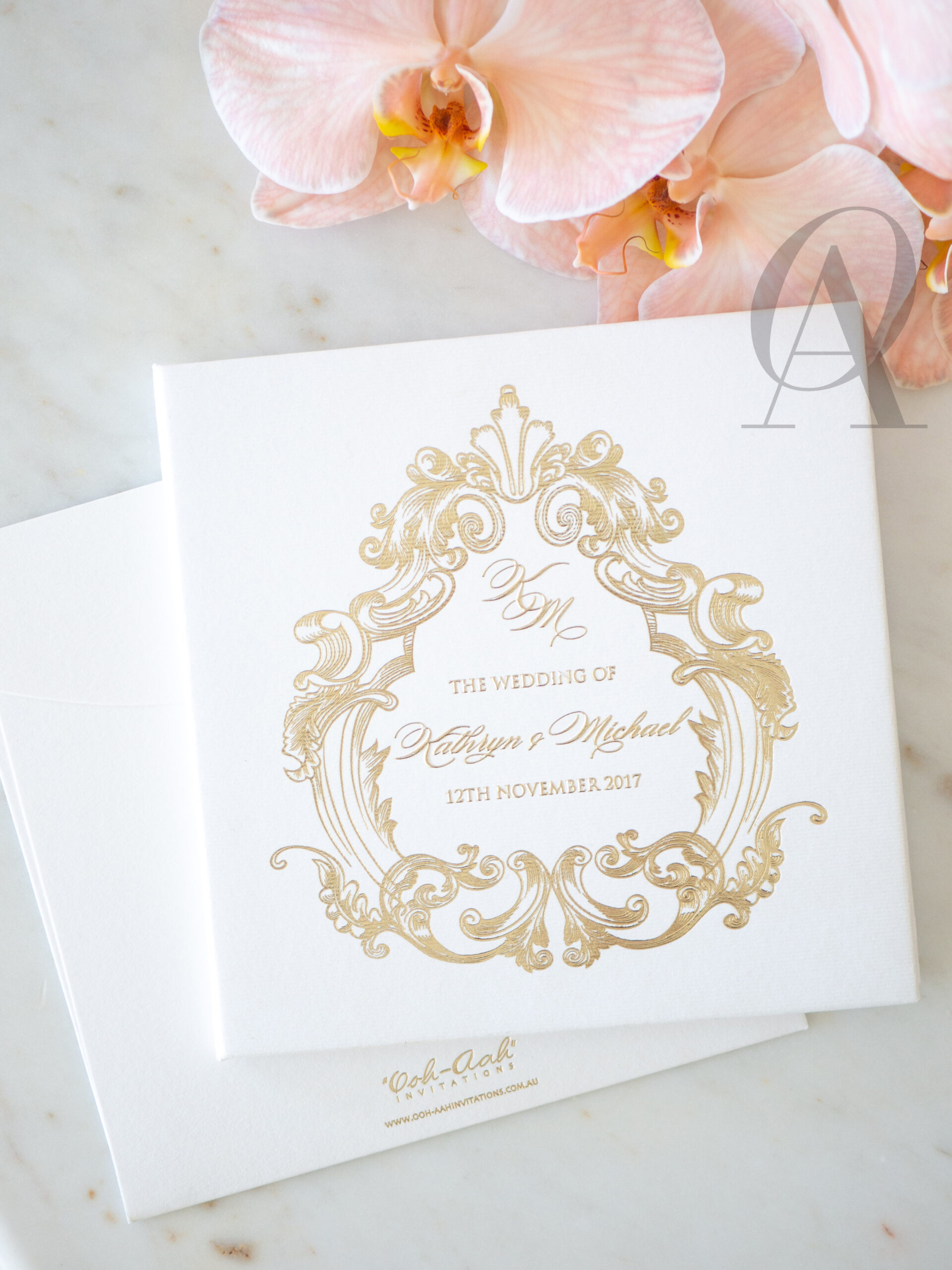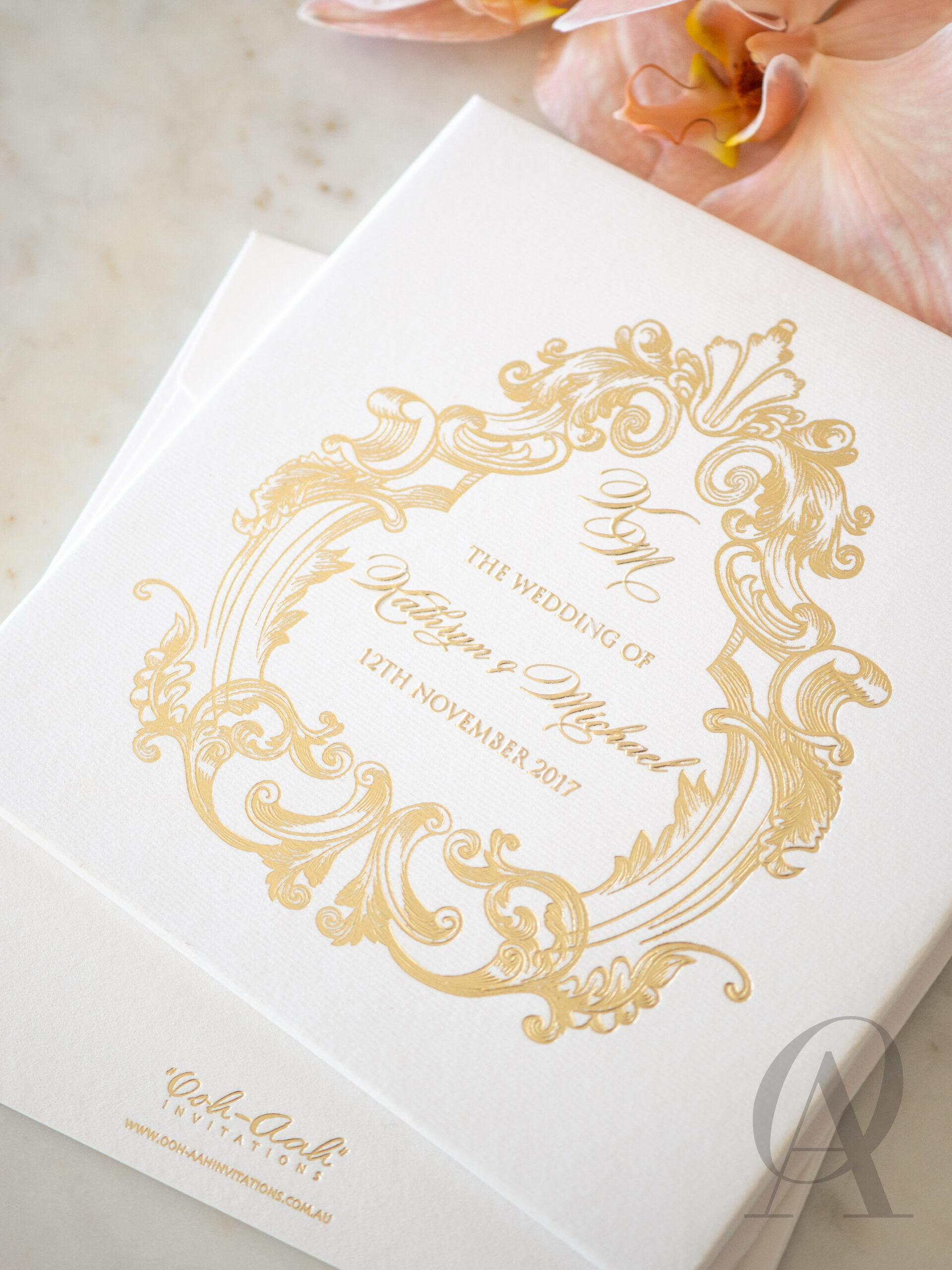 – Internal invitation page printed with your names and a border in gold foil.