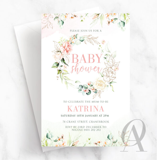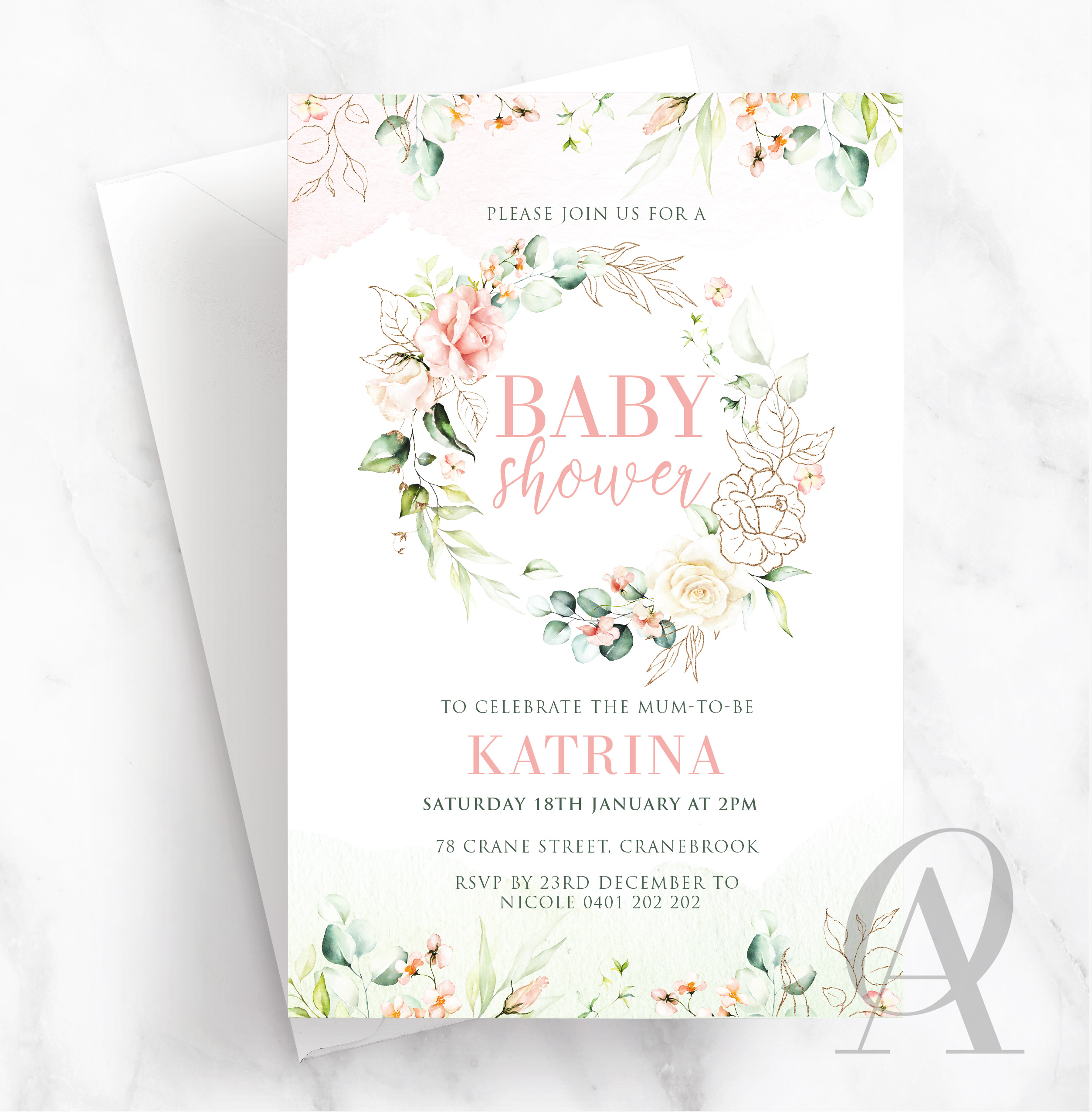 Invite your family and friends to celebrate the anticipating arrival of your baby girl with floral baby shower invitations. This enchanting arrangement of blush pink watercolour florals and lush pastel greenery is perfect for a girl baby shower with a sweet and whimsical garden theme. The refreshing elegance will excite your dear guests for a delightful celebration.