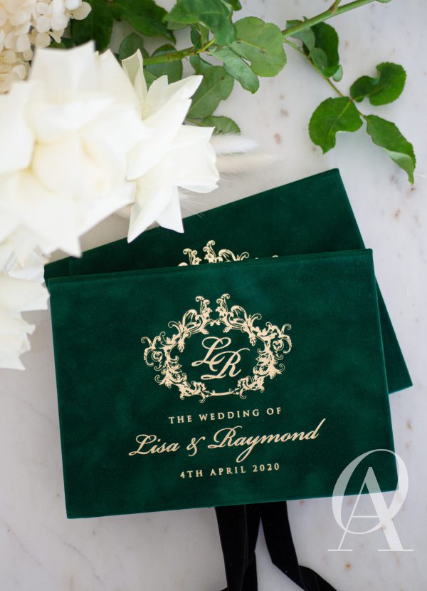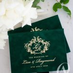 Indulge in supreme luxury right in the palm of your hands. This regal inspired boxed wedding invitation with the grandeur of suede reflects the opulent beauty and elegance you’ve been dreaming for your wedding. The captivating combination of green and gold complements formal and classic styling and sets the tone for a lush and romantic celebration in Summer or Spring. Each one is handcrafted with the irresistible softness of European suede and a premium selection of paper materials to achieve a sensational touch, flawless print and a lasting keepsake cherished by you and your guests.