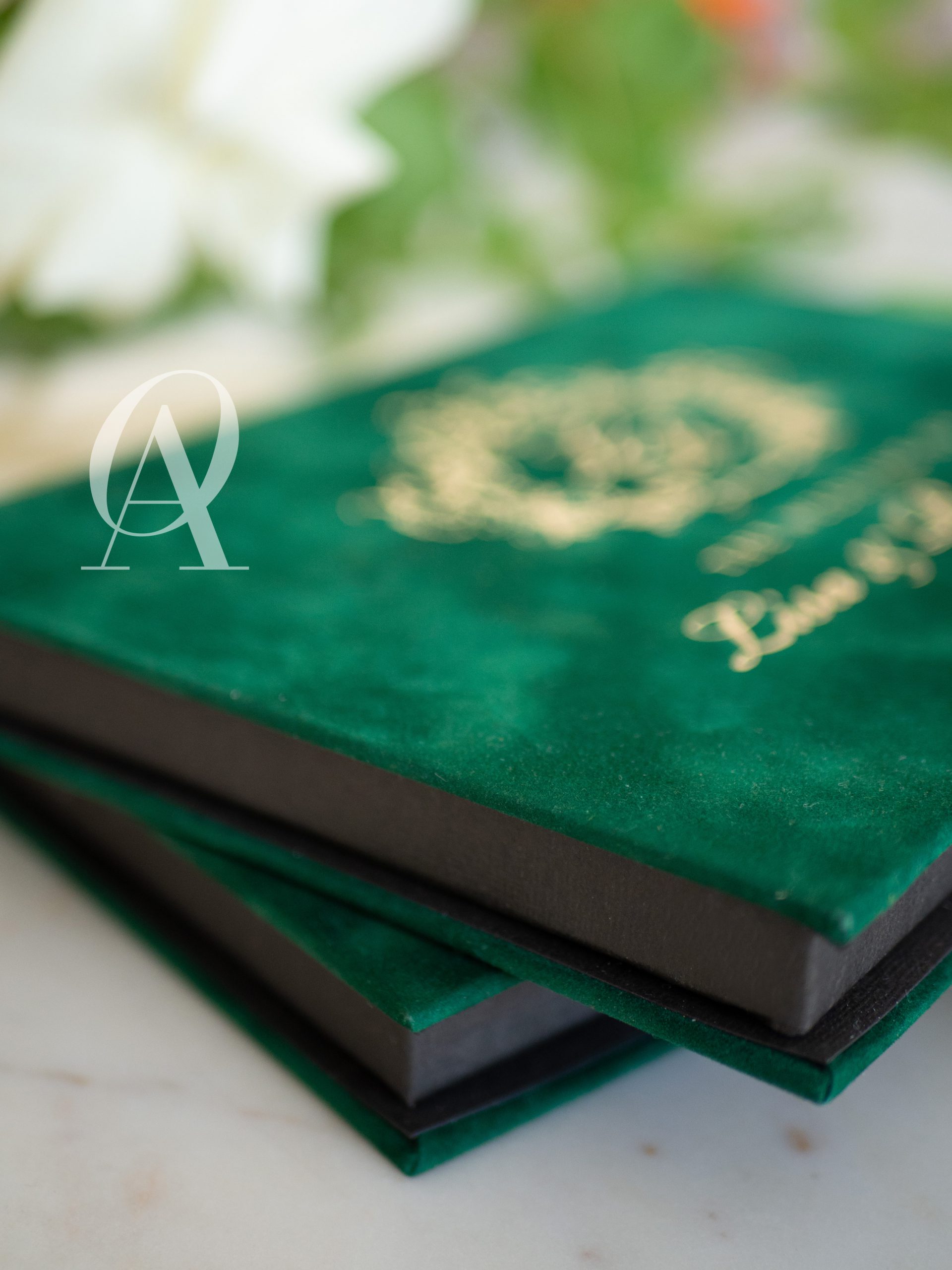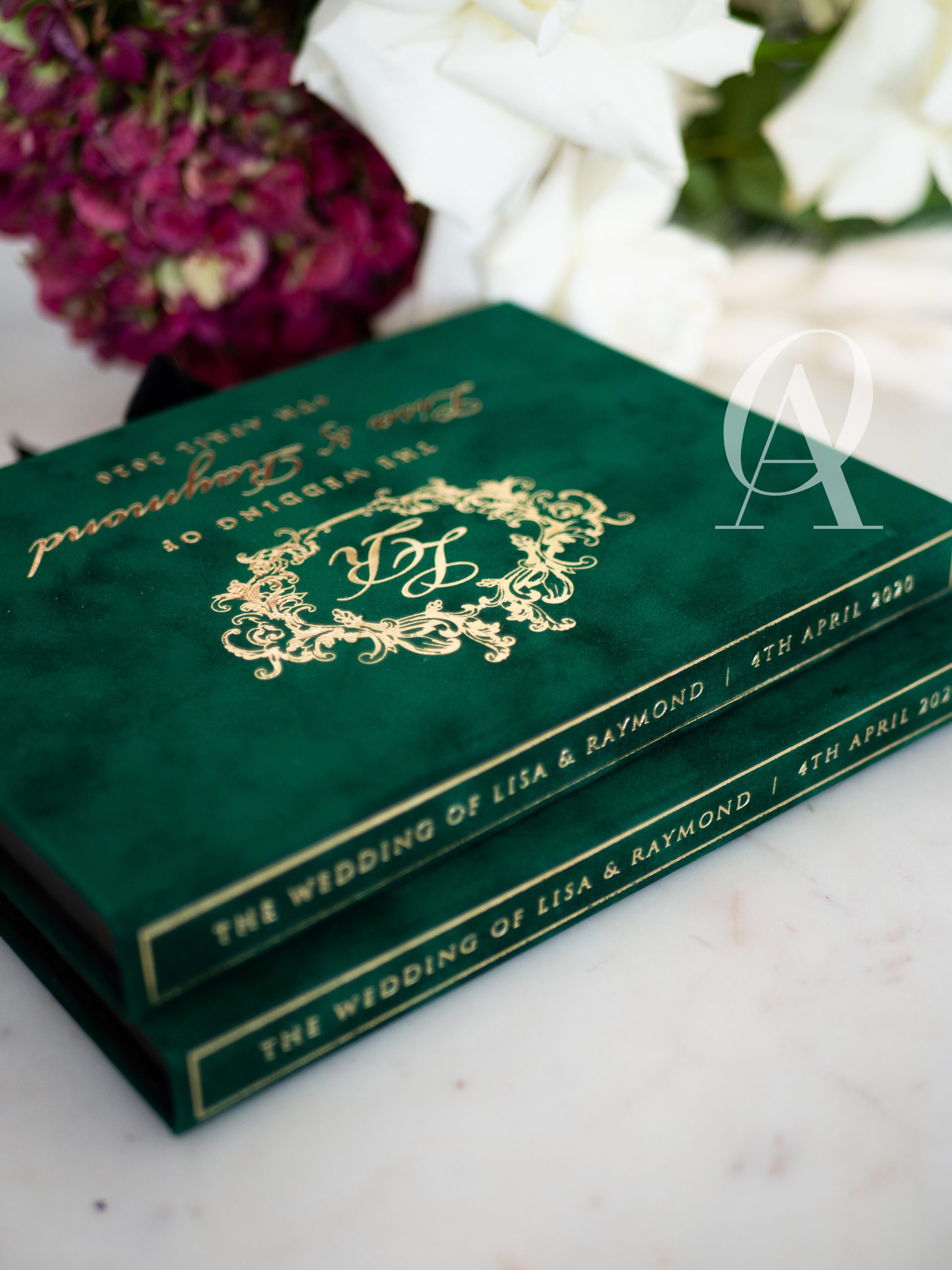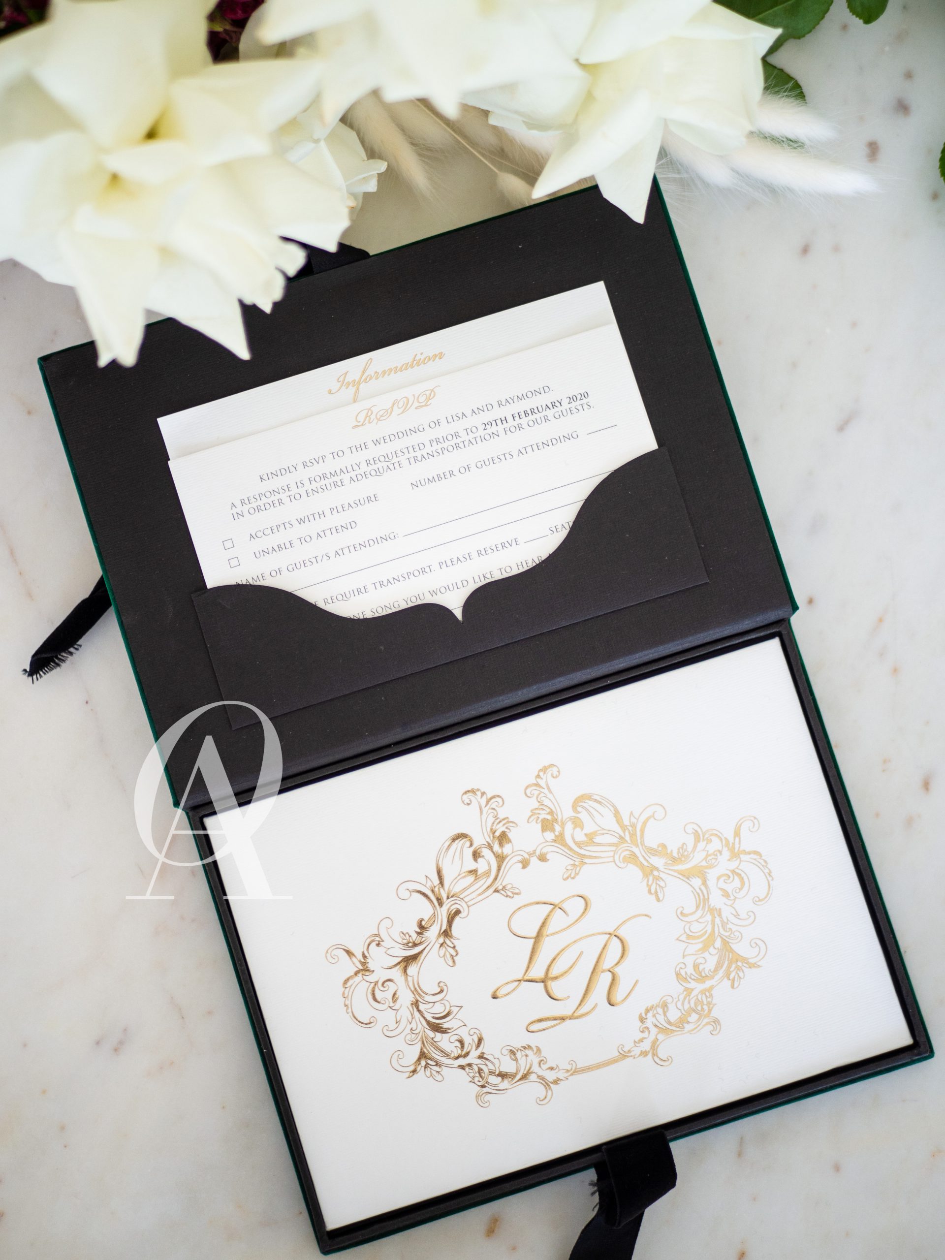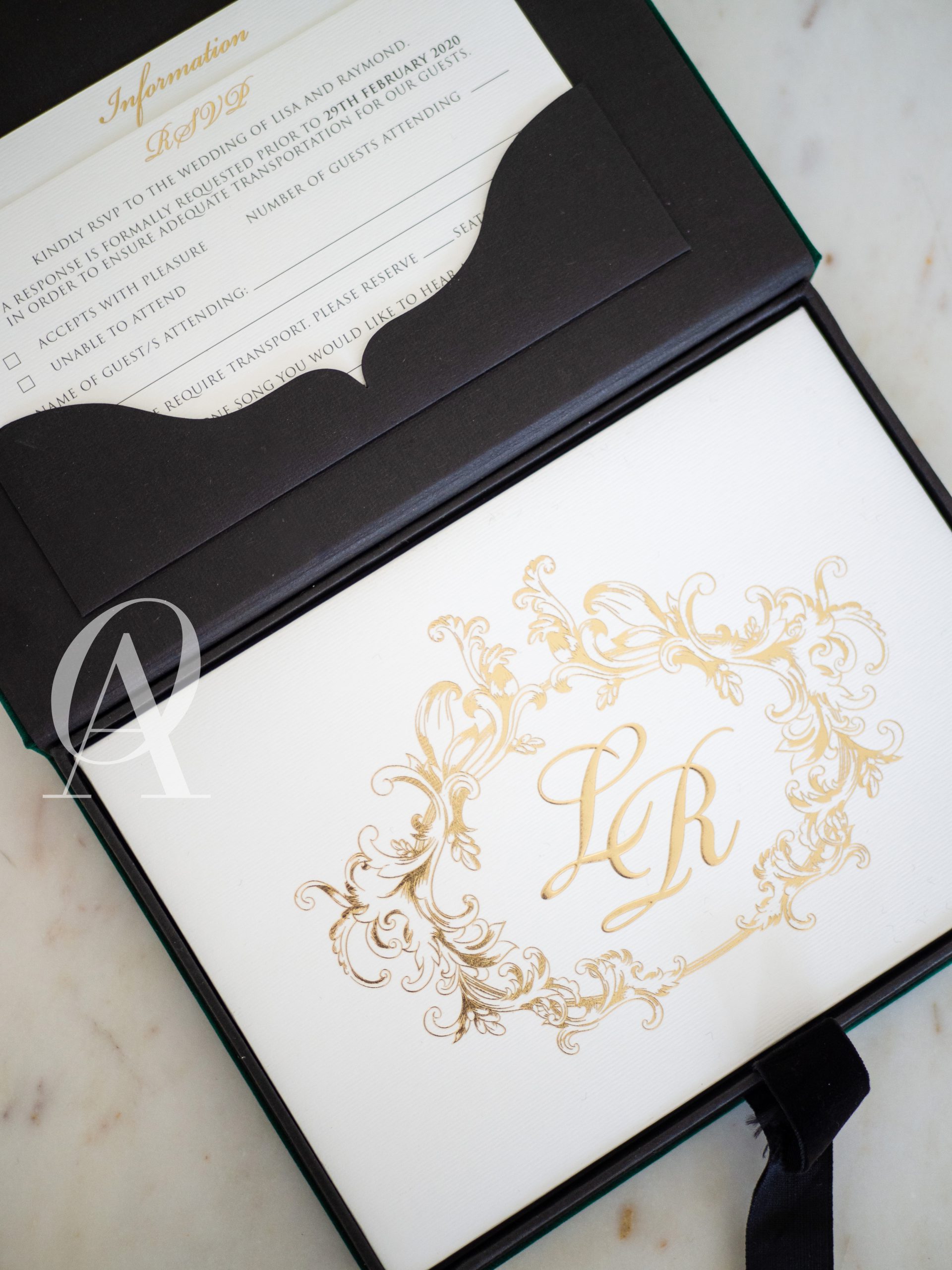 – Matching wedding monogram embossed in gold foil