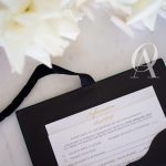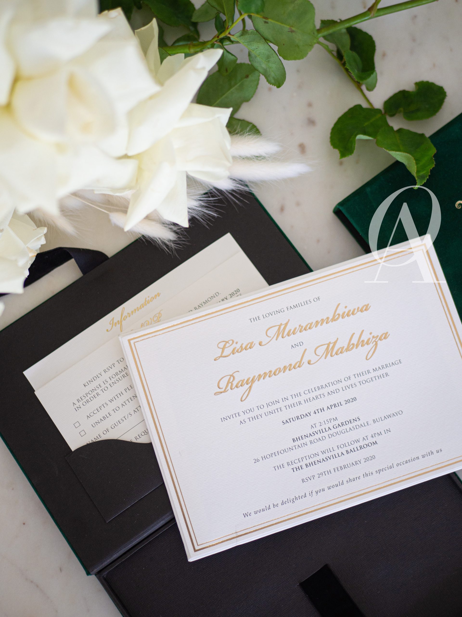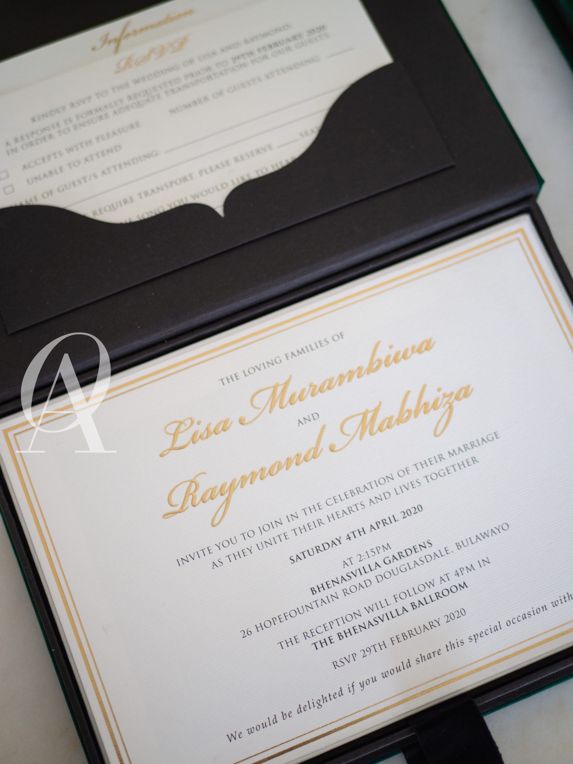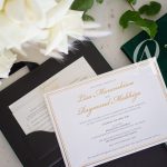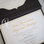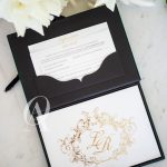 – Main invitation elegantly designed with gold foil detailing.