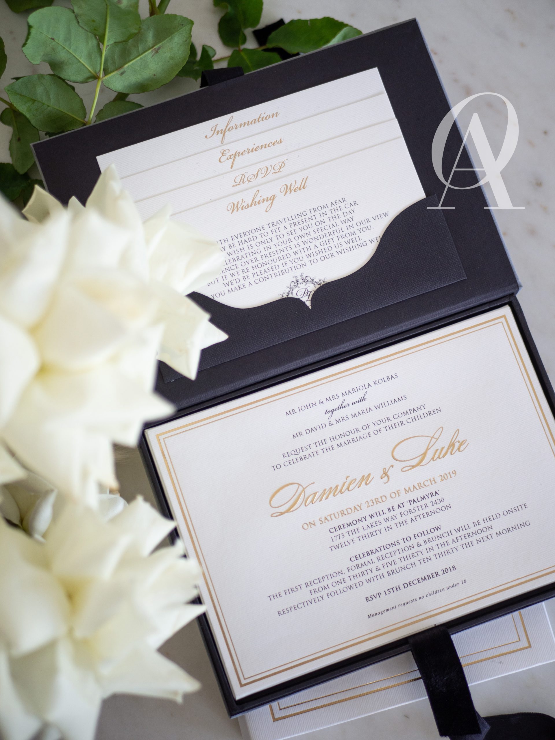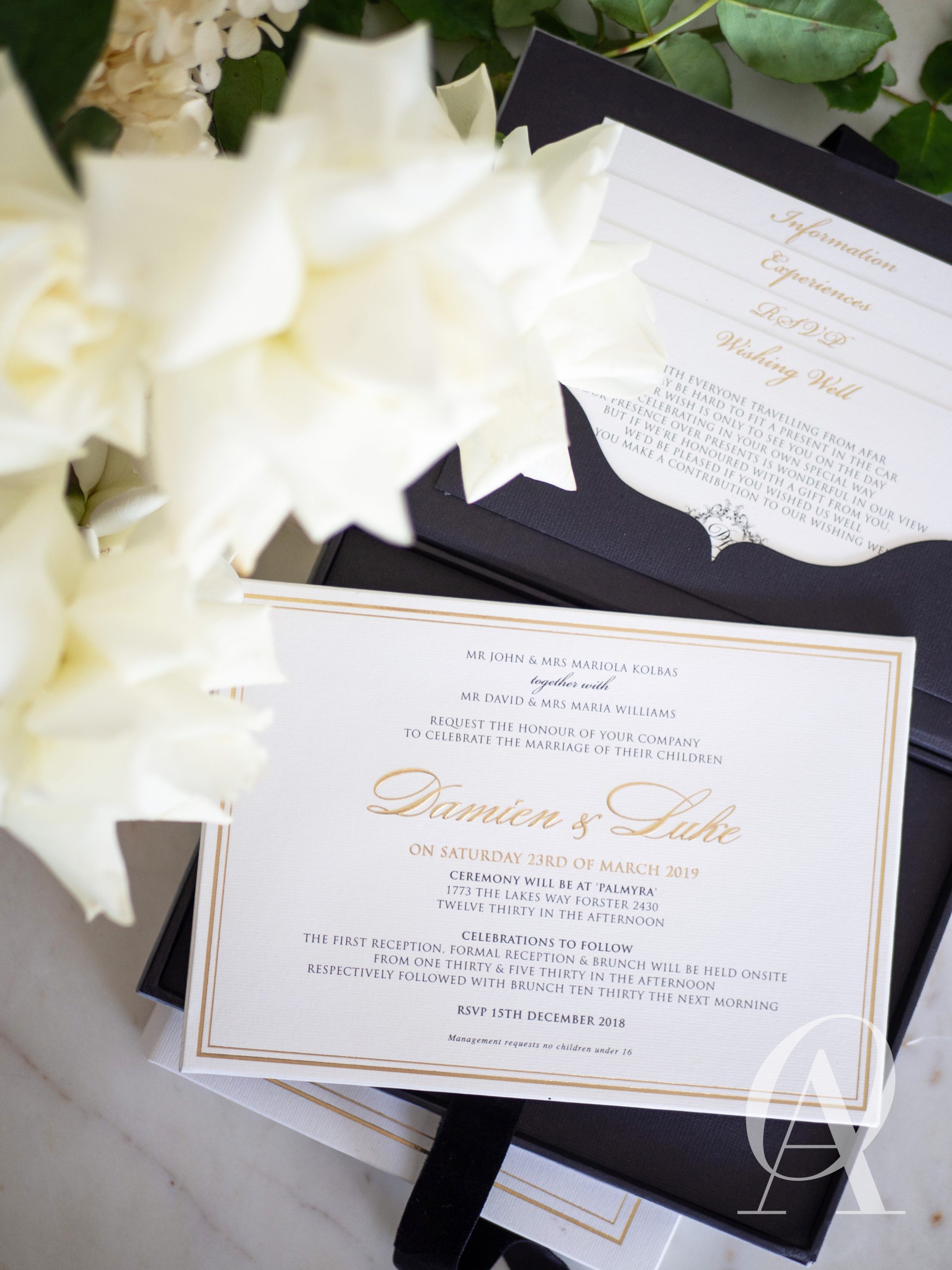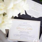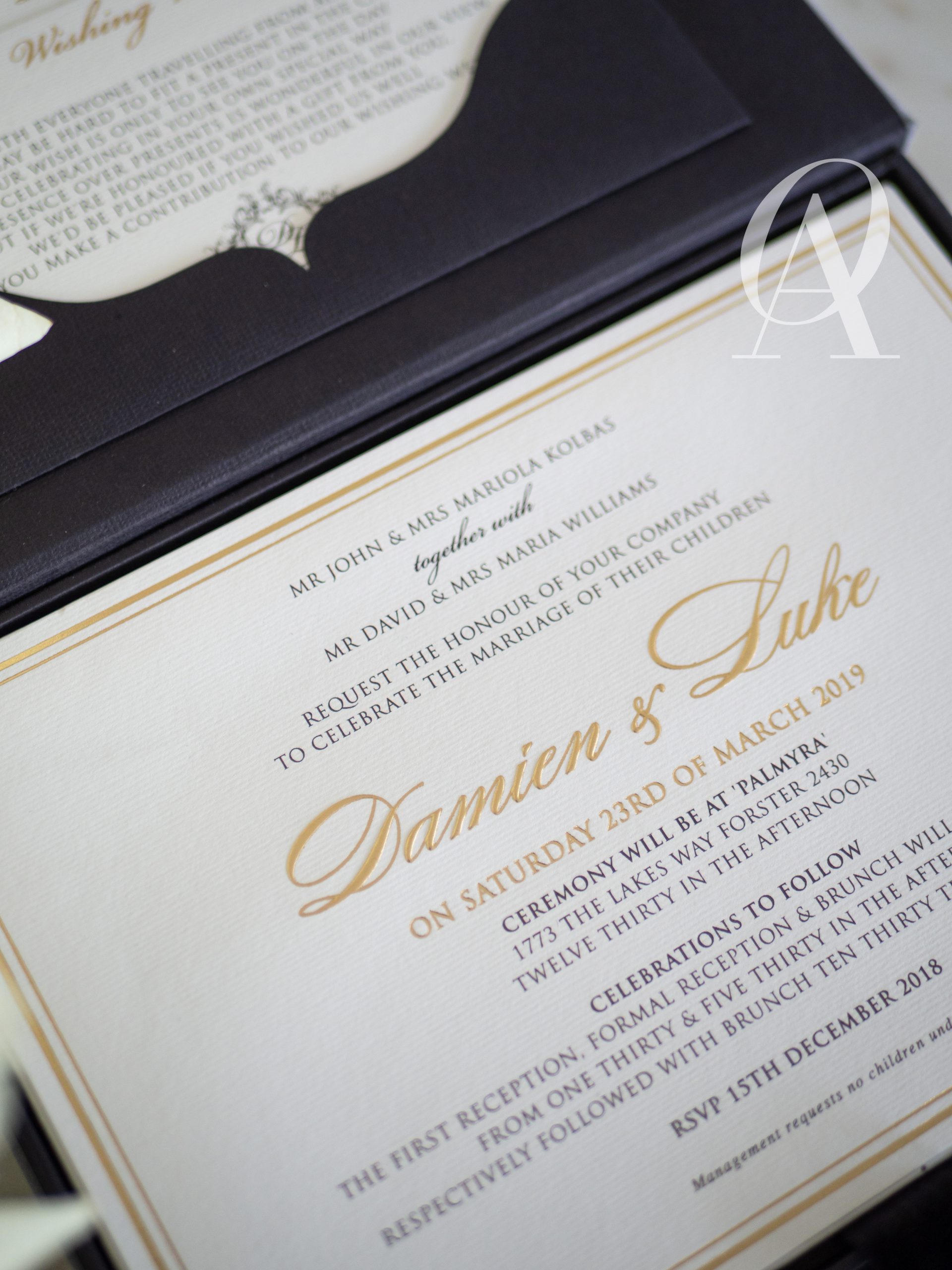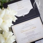 – Main invitation elegantly designed with gold foil detailing.