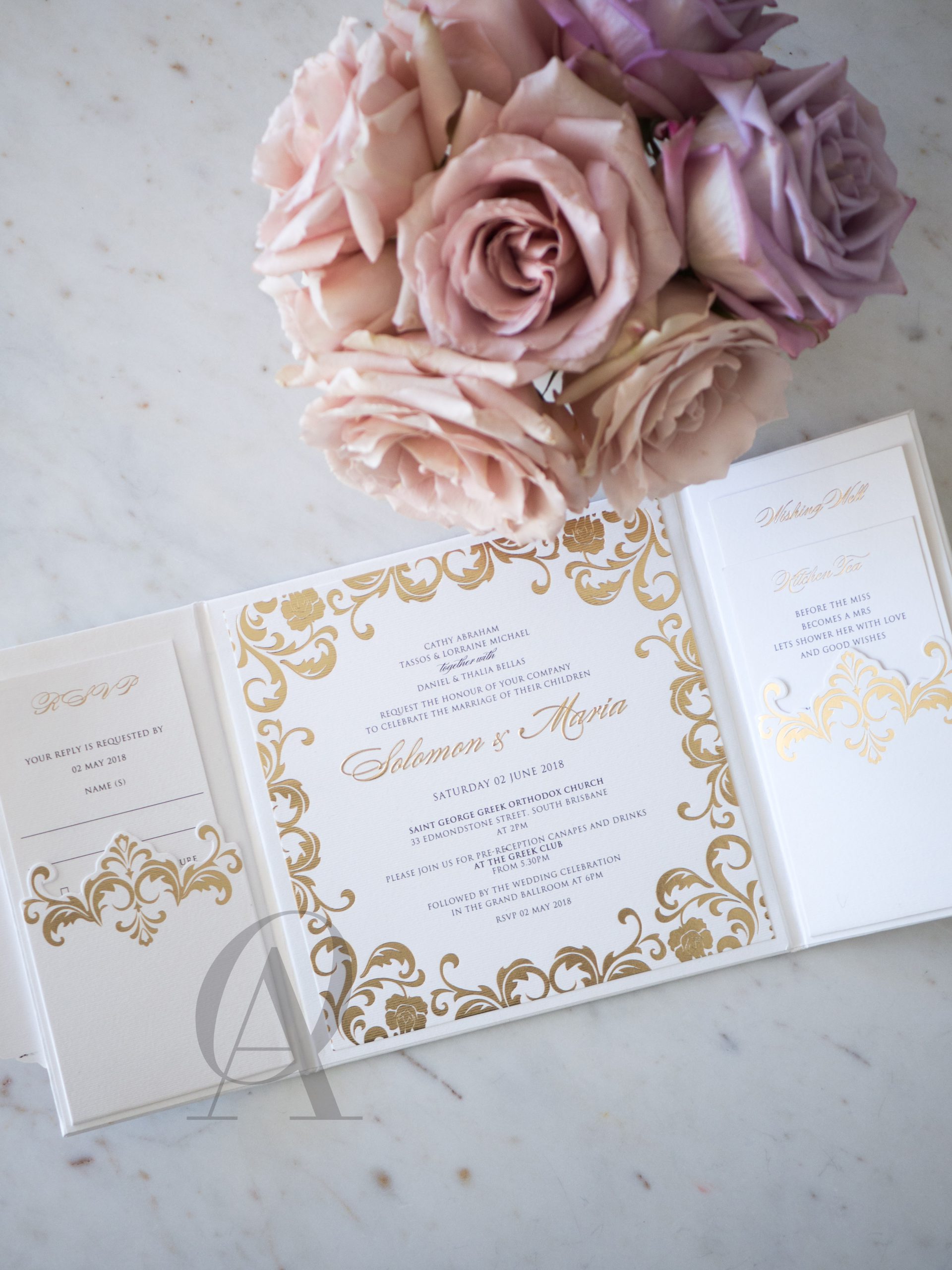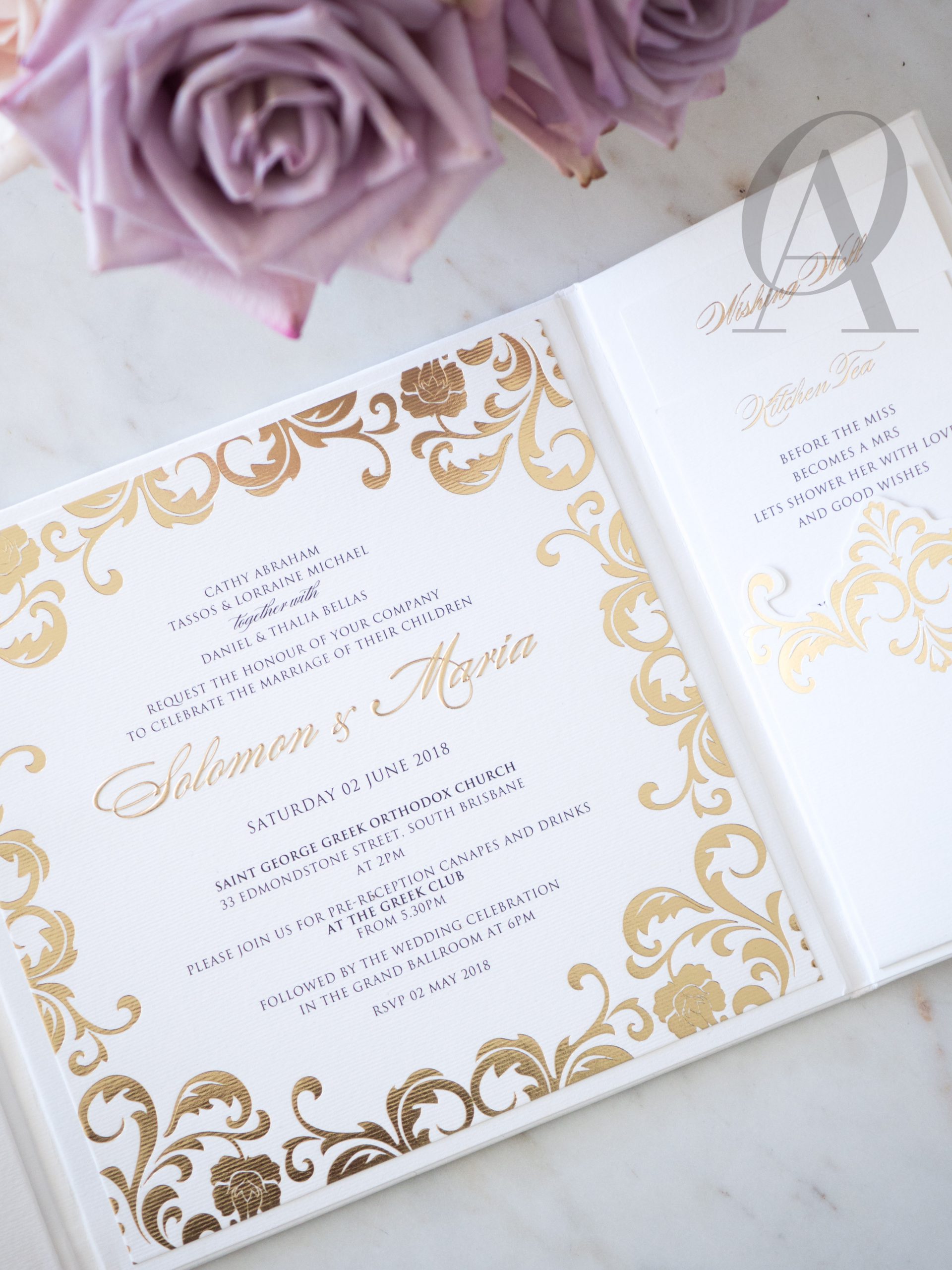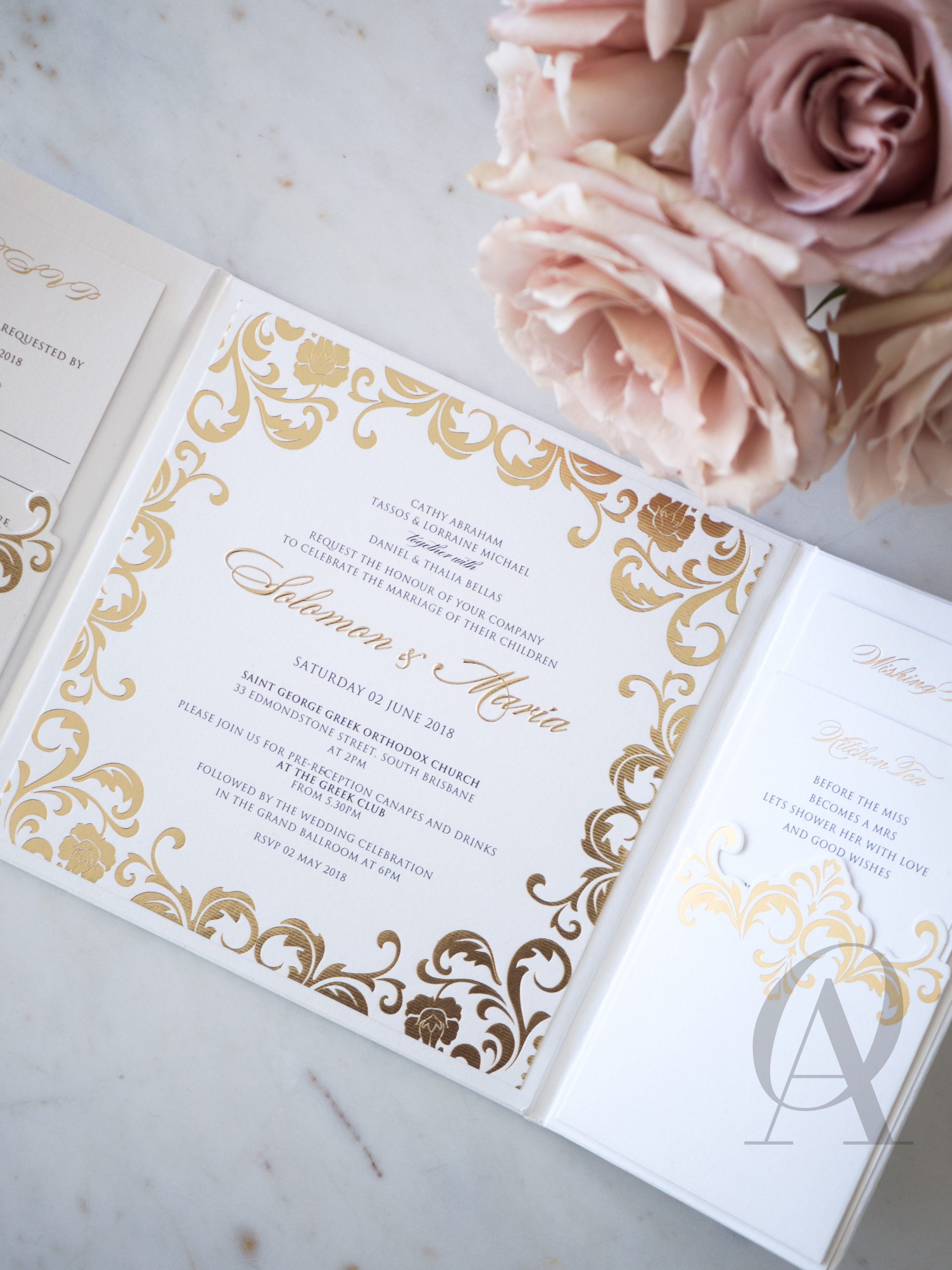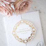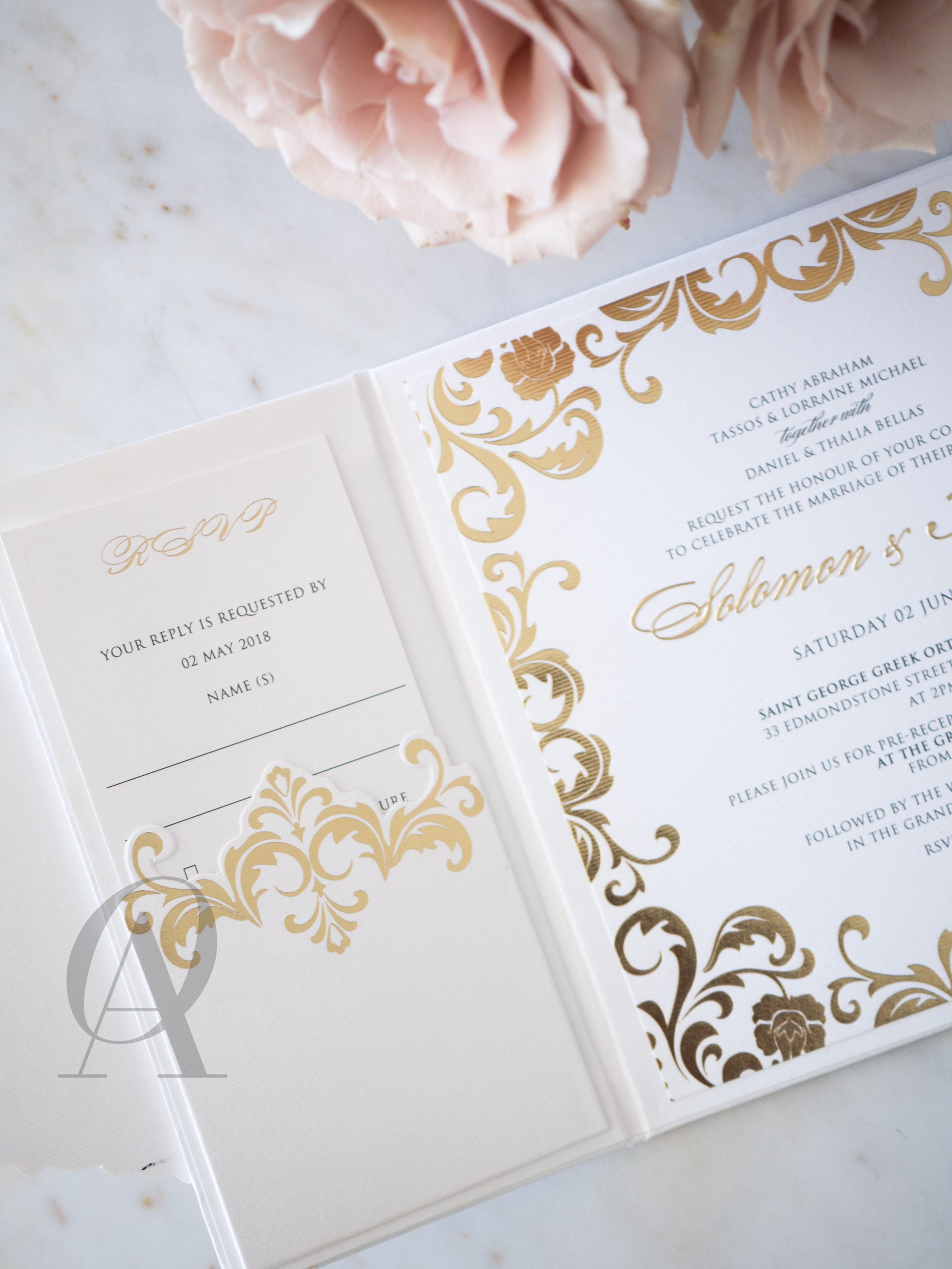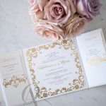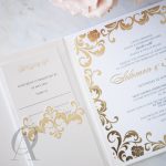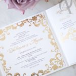 – Internal invitation page printed with your names and a border in gold foil.
