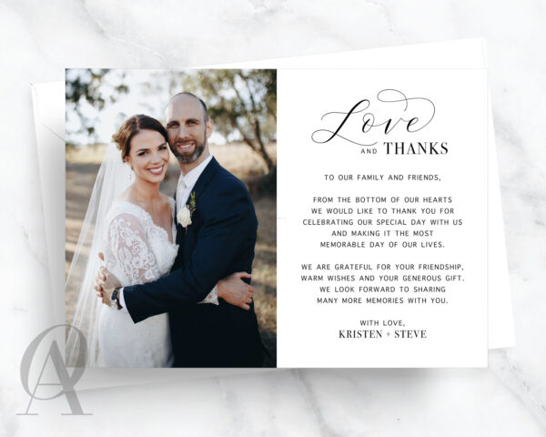 Send love and thanks to your family and friends with wedding photo thank you cards. Photos are a beautiful way for you and your guests to reflect on the magic from your wedding day. Simply choose your favourite photo to complement your thank you message, and we’ll customise the card in your preferred style.