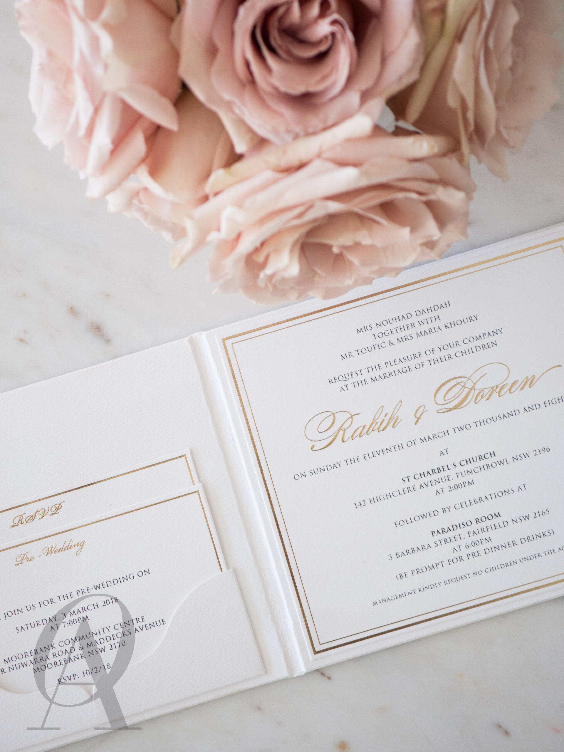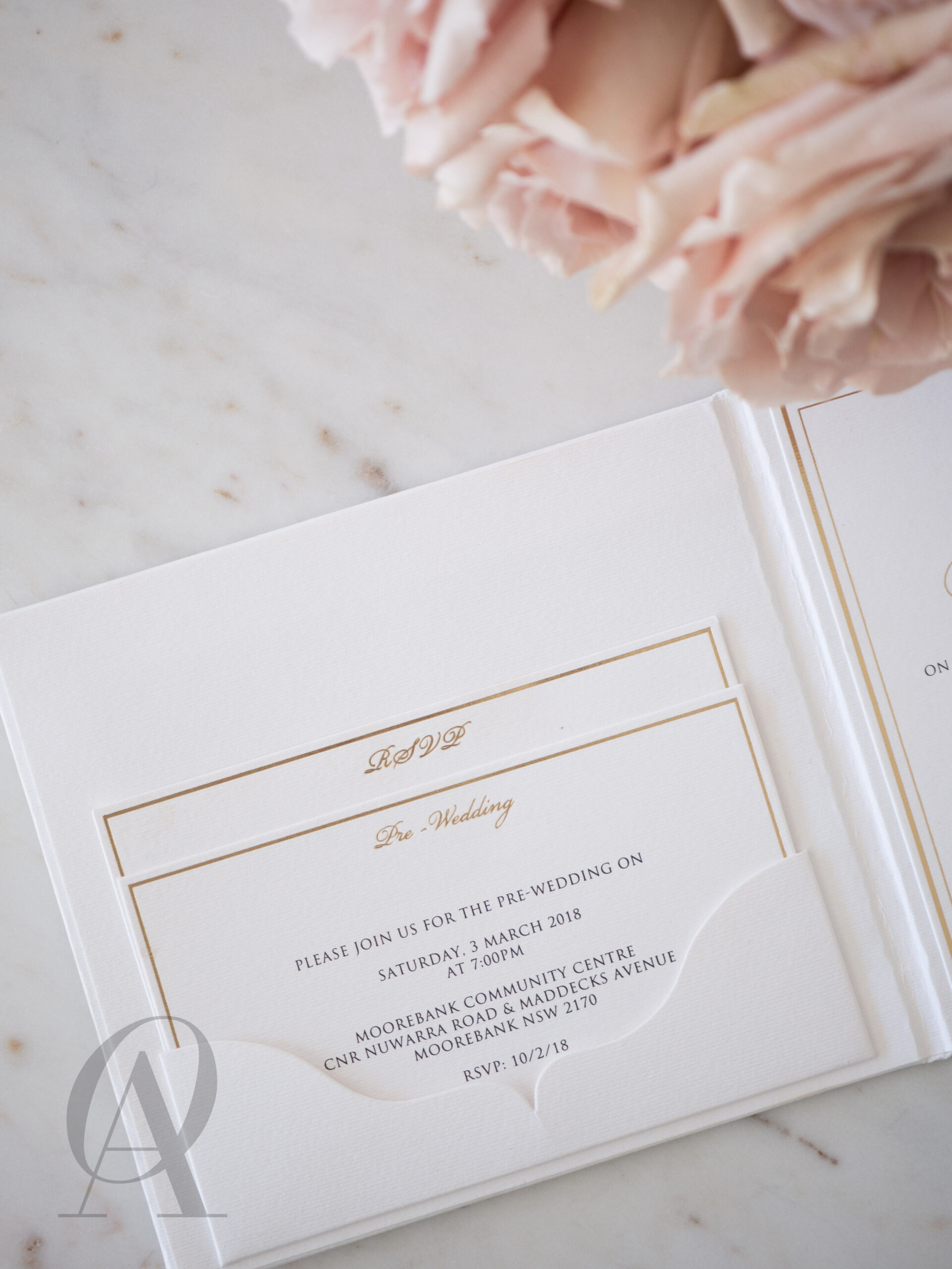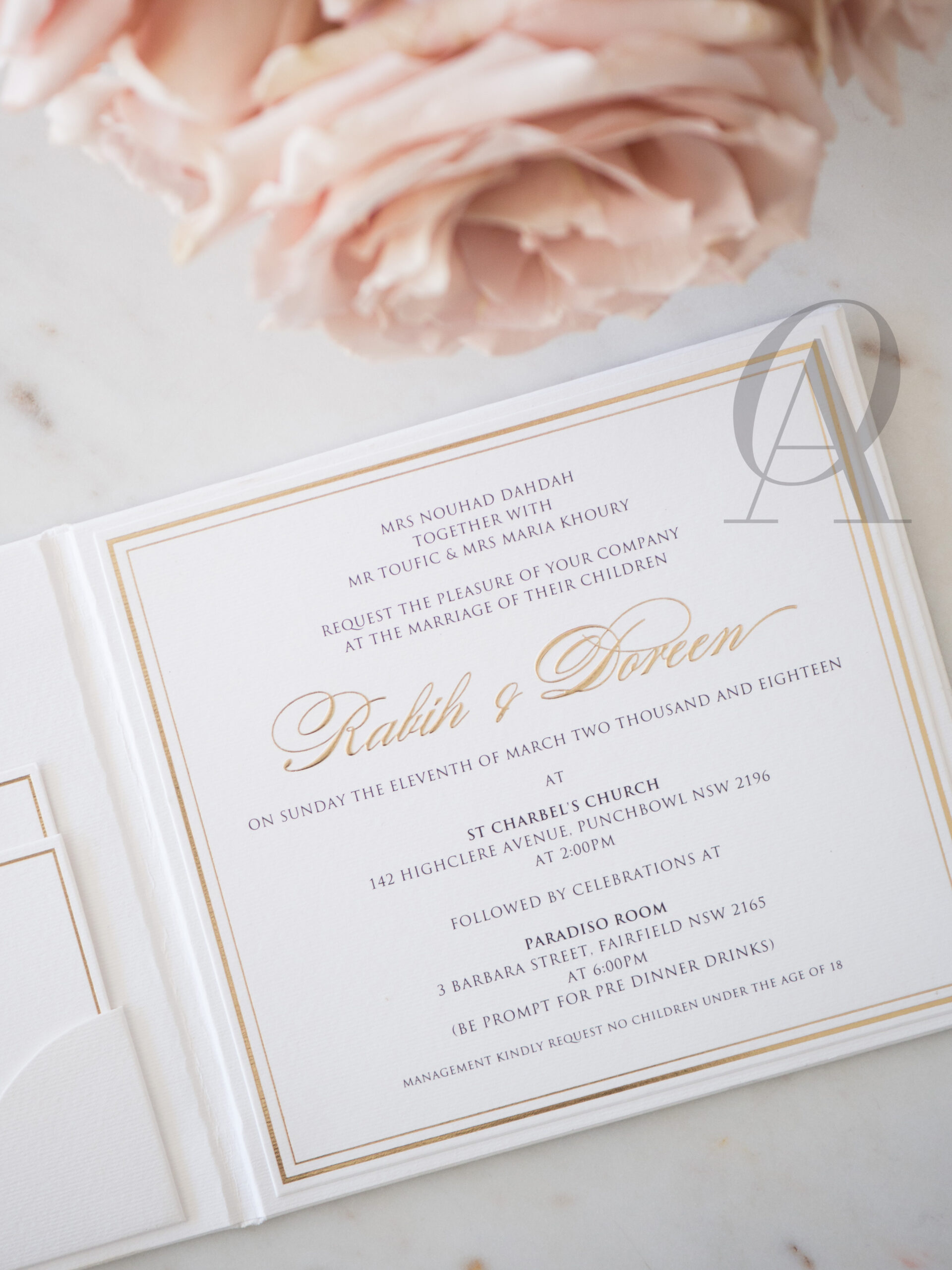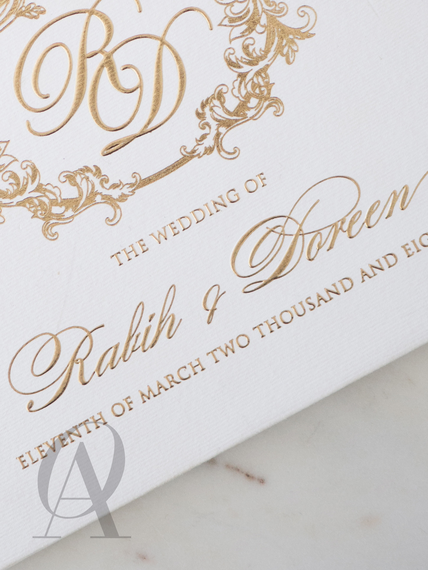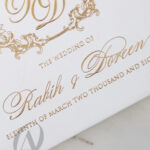 Luxury white and gold wedding invitations are currently trending. We’ve elevated this elegant combination by substituting bright white with ivory. The luxurious shade of ivory shown in this hardcover wedding invitation design exudes elegance and makes a beautiful background to gently radiate the gold foil. A regal wedding monogram with intricate gold linework creates a breathtaking introduction to your big day. Pairing with calligraphy script font enhances your elegant and classic wedding style. Your guests will be mesmerised by the sheer elegance that continues inside.