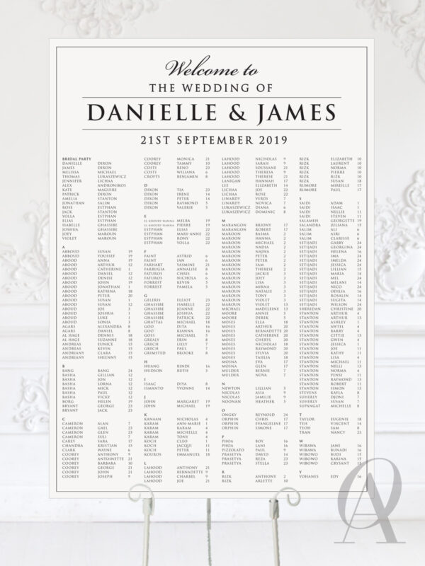 An elegant wedding seating chart with your initials intertwined to represent the celebration of your union. The seating chart is mounted on lightweight foam board and will stand up on an easel. Guests will quickly find their names in a list arranged in alphabetical order by surname at the wedding reception. We can use matching fonts on the seating chart too.