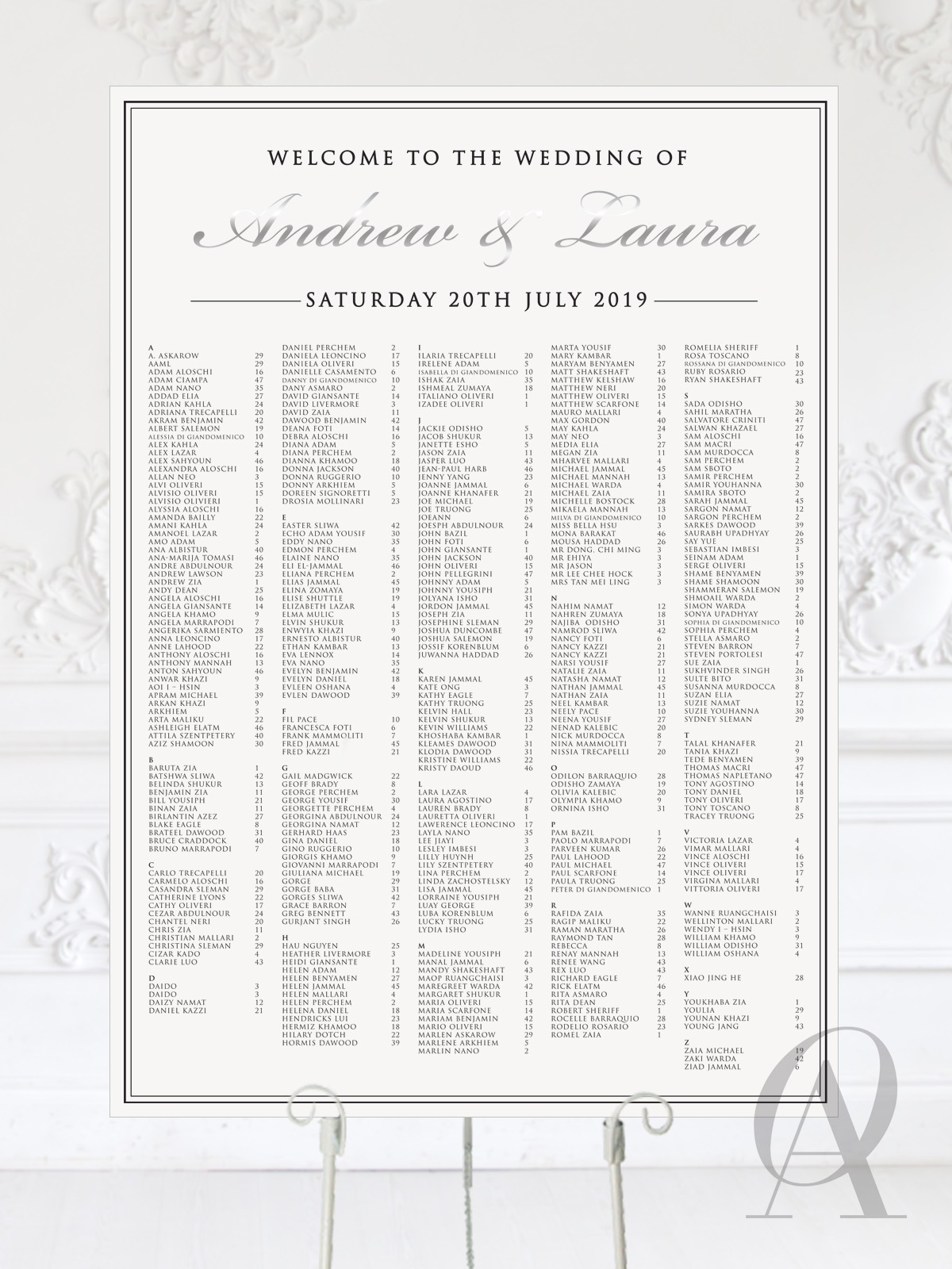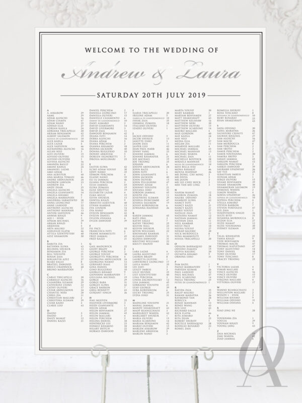 A simple and elegant wedding seating chart with modern script calligraphy. The seating chart is mounted on lightweight foam board and will stand up on an easel. Guests will quickly find their names in a list arranged in alphabetical order by surname at the wedding reception.