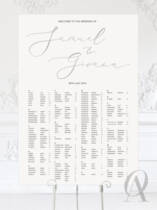 Elevate the look of your wedding seating chart with silver foil on your names. A simple and elegant wedding seating chart with modern script calligraphy. The seating chart is mounted on lightweight foam board and will stand up on an easel. Guests will quickly find their names in a list arranged in alphabetical order by surname at the wedding reception.